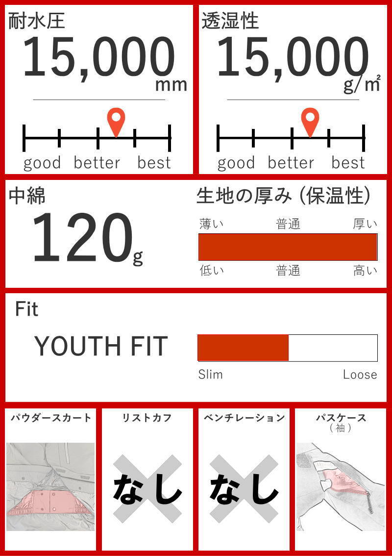 ・耐水圧:15,000mm ・透湿性:15,000g ・中綿:120g Body/100g Sleeve ・FIT:YOUTH FIT ・4-Wayストレッチ 2レイヤー構造素材 ・テープ処理されたシーム ・2-Way撥水ジッパー ・メッシュ裏地付きジッパー式ベンチレーション ・ストレッチウエストゲイター ・ゴーグルポケット ・起毛トリコットポケット裏地 ・メディアポケット、隠しバンジーコード付き裾 ・クイック収納スリーブパスポケット ・調節可能なリストシンチ ・ウェストのパウダーガード:あり ・手首部分のカフ:なし ・脇の下のベンチレーション:なし ・パスケース:あり(袖) ・生地の厚さ:やや厚い |