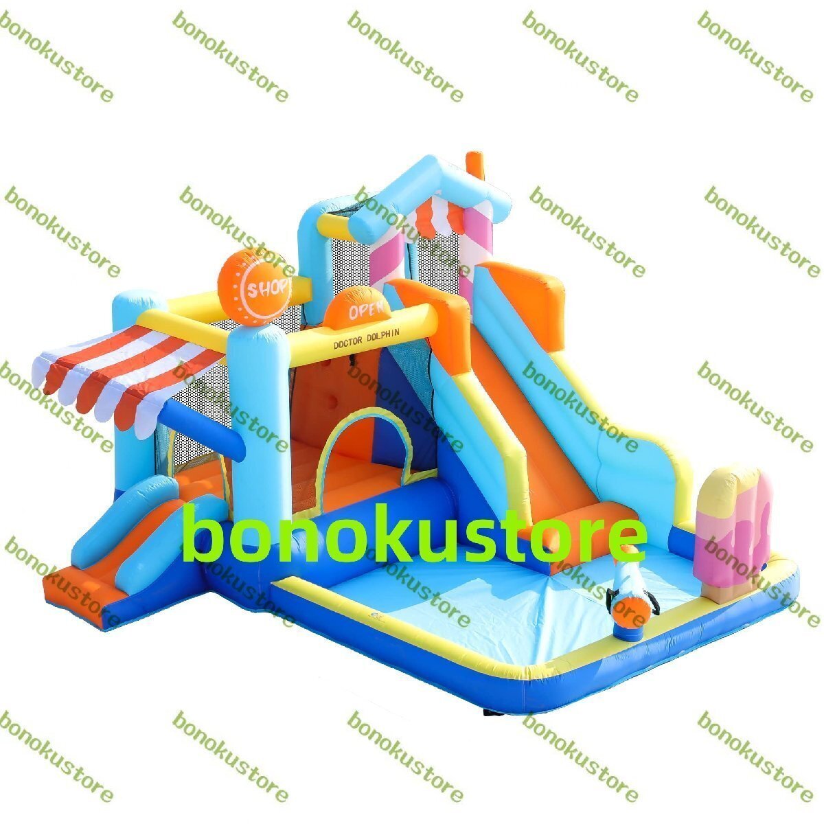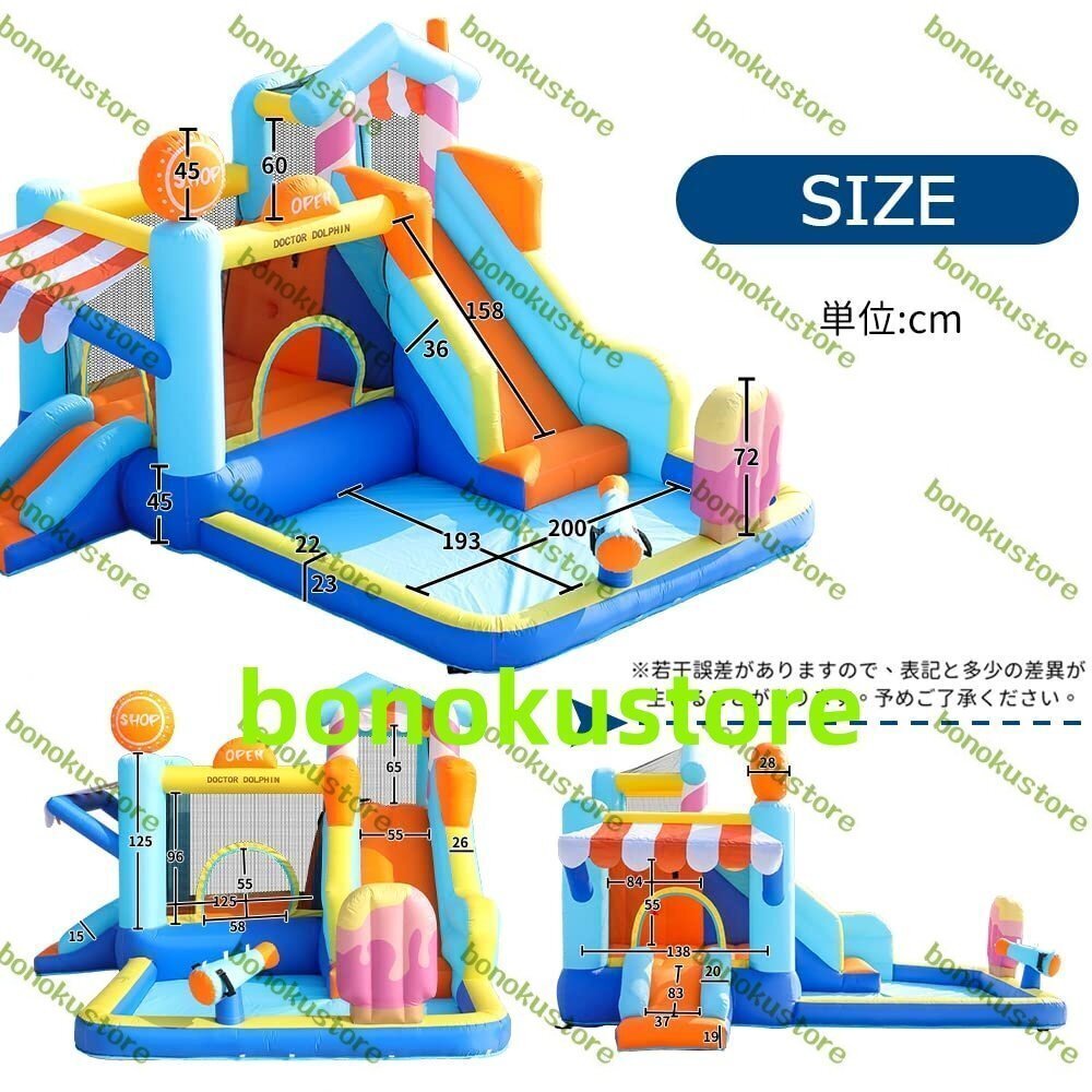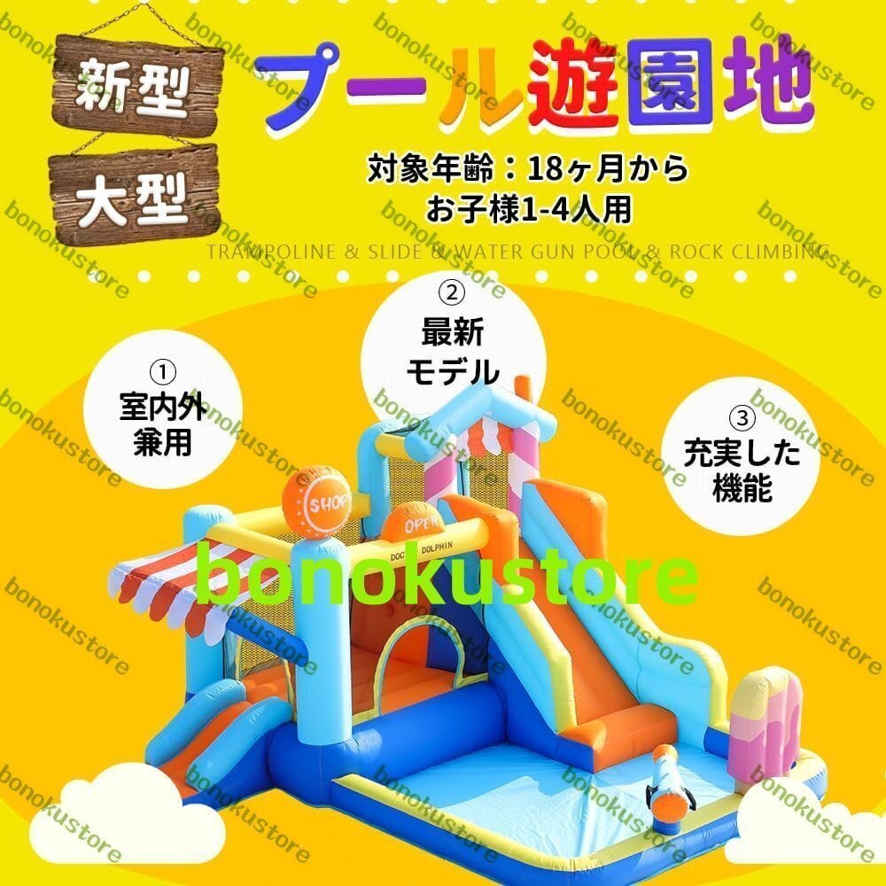トランポリン&すべり台&水鉄砲つきプール&岩登り 新型 大型プール遊園地 対象年齢:18ヶ月から お子様1-4人用 ※当製品は体重30kg未満のお子様用 体重30kg以上のお子様や大人が使用すると、縫い目の穴が広がったり生地が抜け、しっかりと膨らまなくなる恐れがあります。 必ず耐荷重を守ってご使用ください。 お子様1-4人用:30kgx4人=合計耐荷重120kg お子様1-5人用:30kgx5人=合計耐荷重150kg 。