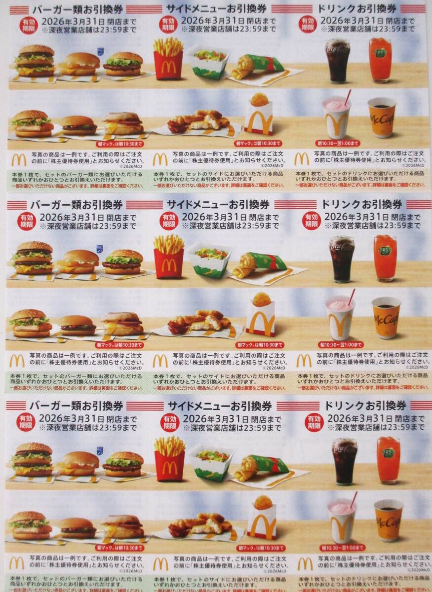 ★商品説明★ マクドナルドの株主優待引換券3セット(①②③×各3枚)です。 ①バーガー類引換券×3枚 ※夜マックパティ倍、サムライマック ②サイドメニュー引換券×3枚 ※ポテトLサイズ ③ドリンク引換券×3枚 ※ドリンクLサイズ、キャラメルラテMサイズ、各種マックフロート ※は引換可能なお得感(価格)の高い商品例です。 ★有効期限★ 2026年3月31日迄 ★発送方法★ ・定形郵便(追跡なし、補償なし)¥110 ※定形郵便は配達日数が遅め(土日祝を除いて最短3~5日程度)です。 ・ネコポス(追跡あり、補償あり)¥230 ※土日祝の配達あり、急ぎの方はこちらをおススメします。 ★注記★ ・取引簡素化の為、取引メッセージでの挨拶等は不要です。落札者様の支払完了後、24時間以内に発送します。 ・評価は頂いた方のみ付けさせて頂きますので、不要な方はこちらへの評価も不要です。 マイナス評価の多い方は入札をご遠慮下さい。入札頂いても、こちらで削除させて頂きます。 ノークレーム・ノーリターンでお願い致します。 |