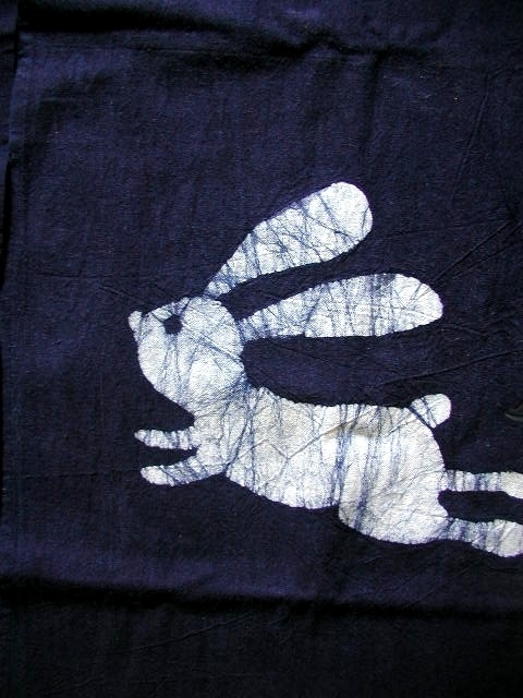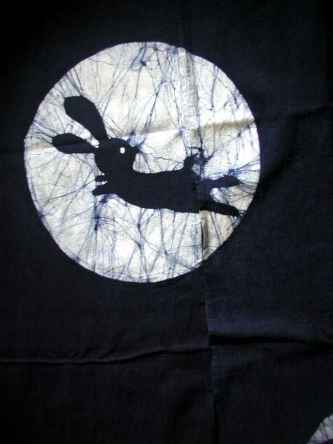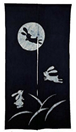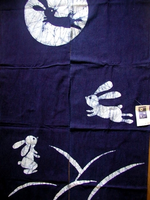 ●【送料無料】新品・藍染・綿ろうけつ染めのれん・月とうさぎ・150㎝●