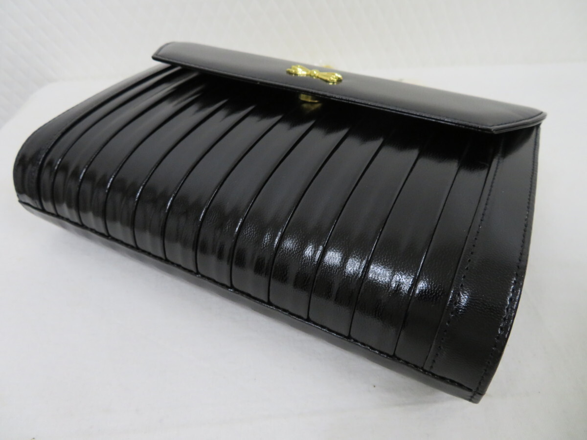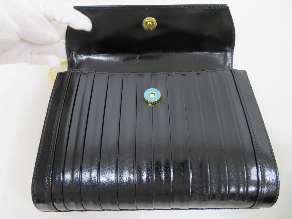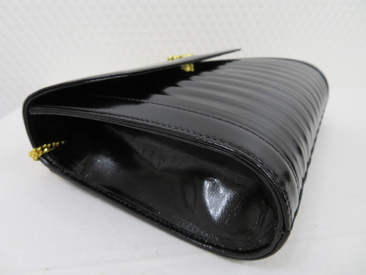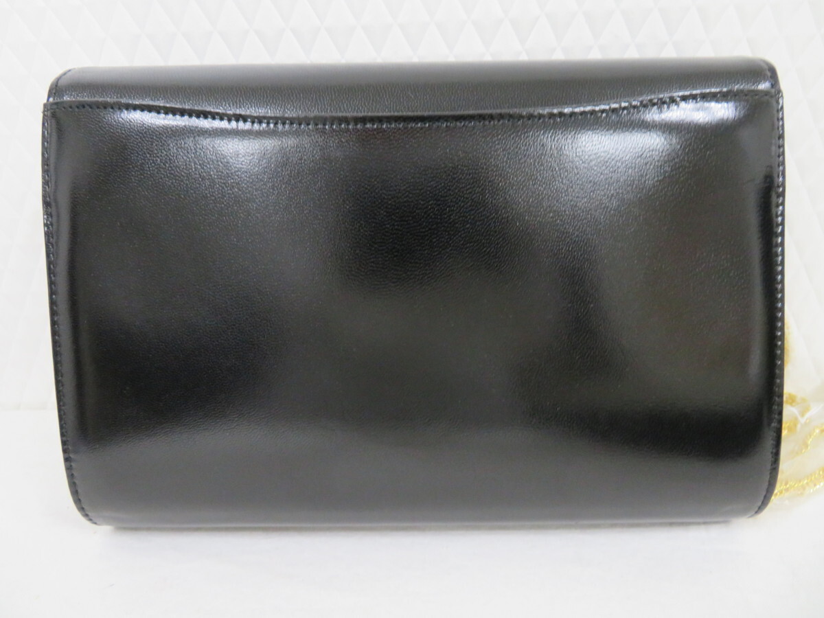こちらのお品は黒の光沢感のあるカーフ素材のクラッチバッグで、着脱可能なゴールドのお色目のチェーンを付ければショルダーバッグとしてもお使いいただけます。