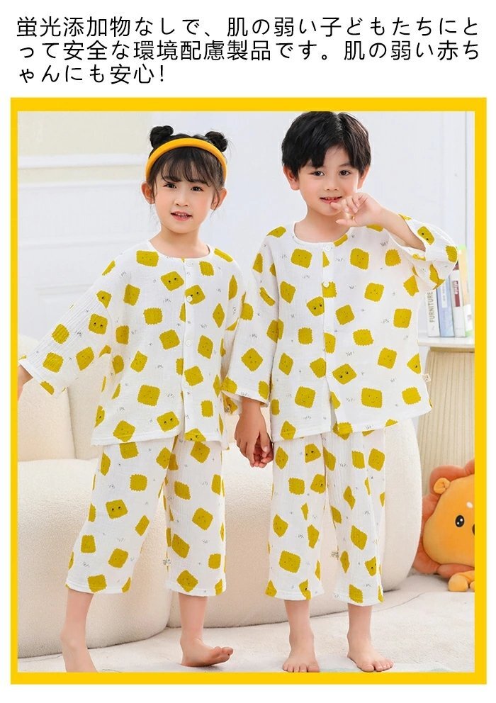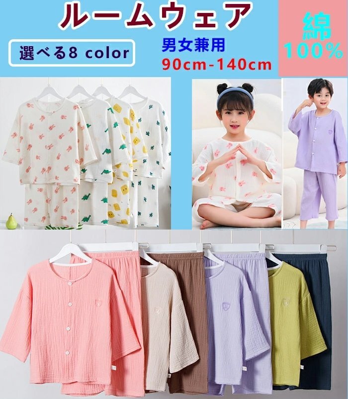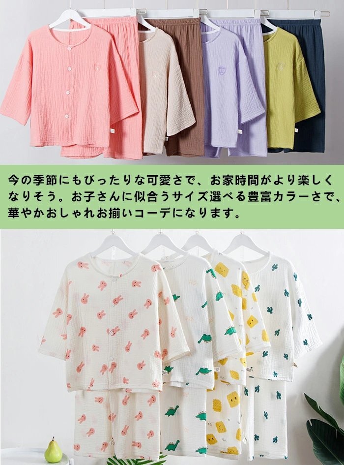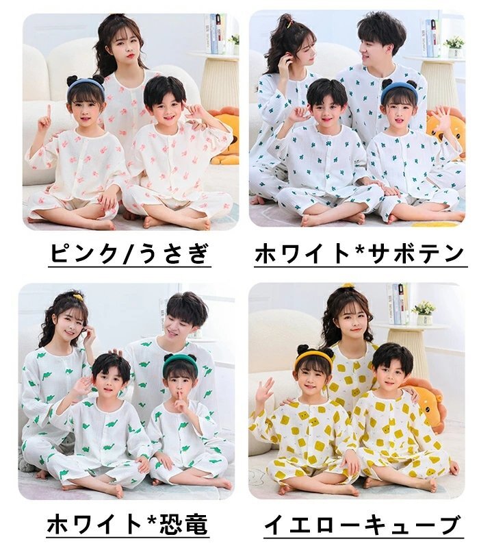 キッズルームウェア パジャマ 子供 七分袖 恐竜 男の子 前開き クルーネック 女の子 レディース ルームウェア ☆8色/90~140選択/1点