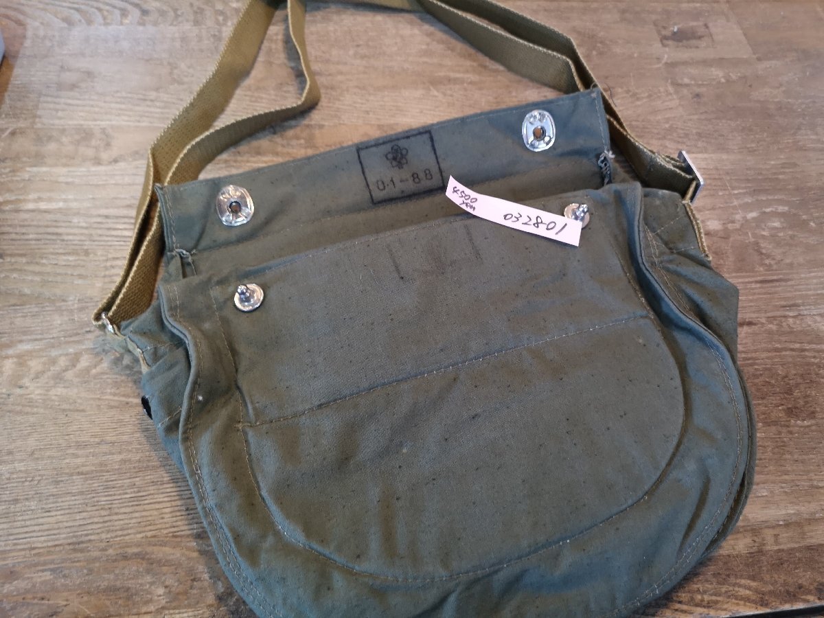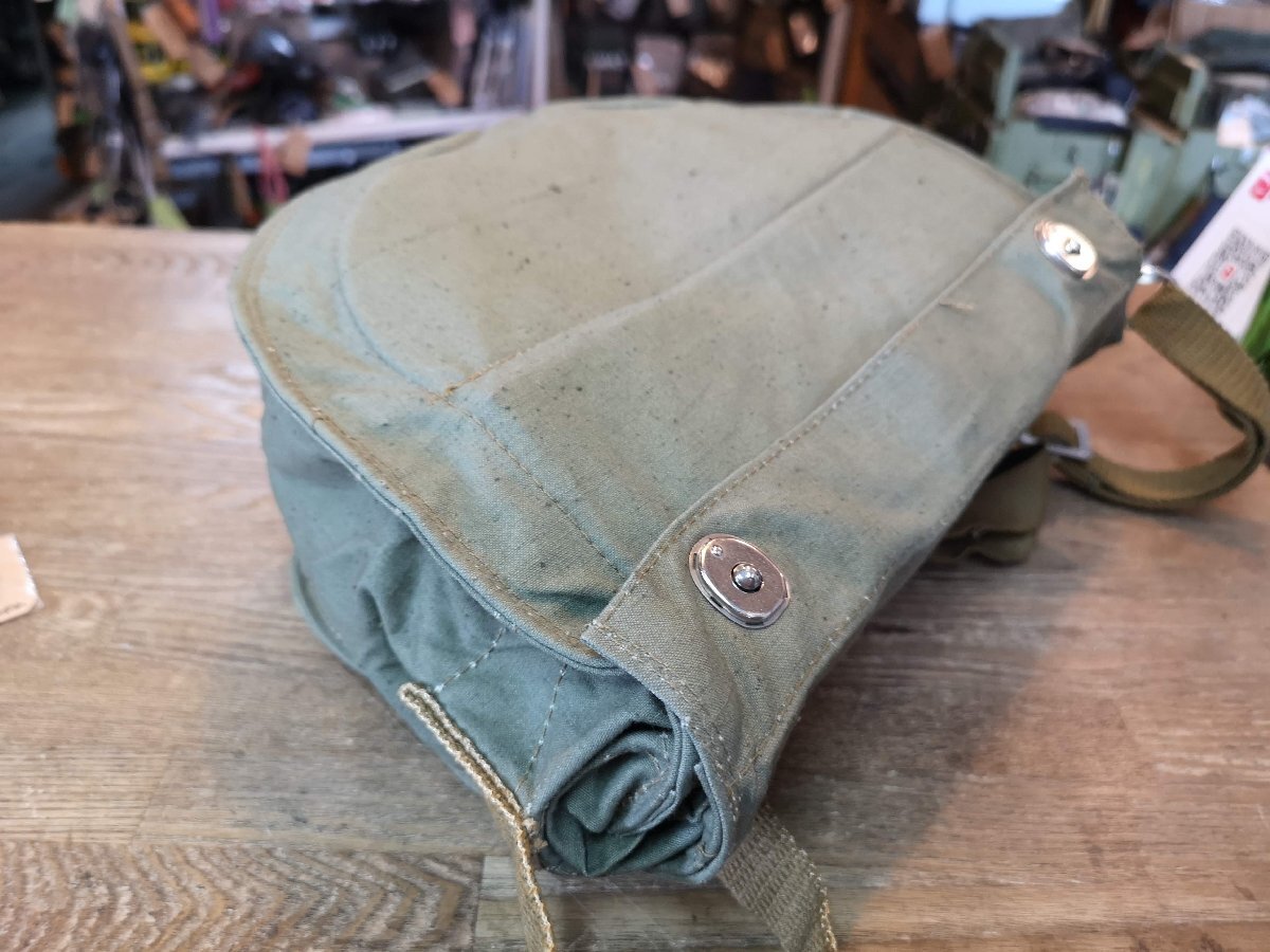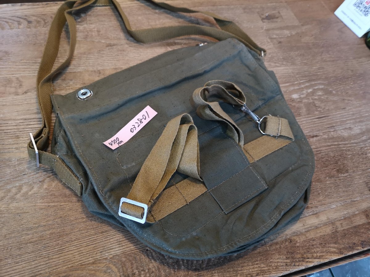 ソビエト軍にて70年代初頭に採用されたPBFガスマスクセットを収納するショルダーバッグです。 2つのドットボタンで開閉するコットン製のバッグで、生地は薄手ですが前面、背面の一部、前面背面の口のフチに薄い板が入っています。 内側は前面とマチに1つポケットがあります。 外側はマチに1つポケットがあります。 ショルダーストラップとウエストストラップは長さ調節可能です。 背面には幅約6cmのベルトループがあります。。写真の1.2.3.4枚目は流用です。 本体寸法 高さ約22cm、横約26cm、マチ約9cm ショルダーストラップ 約65~125cm 沖縄離島を除く全国500円でお送りいたします、落札価格にプラスでお願いいたします。キャンプ用品