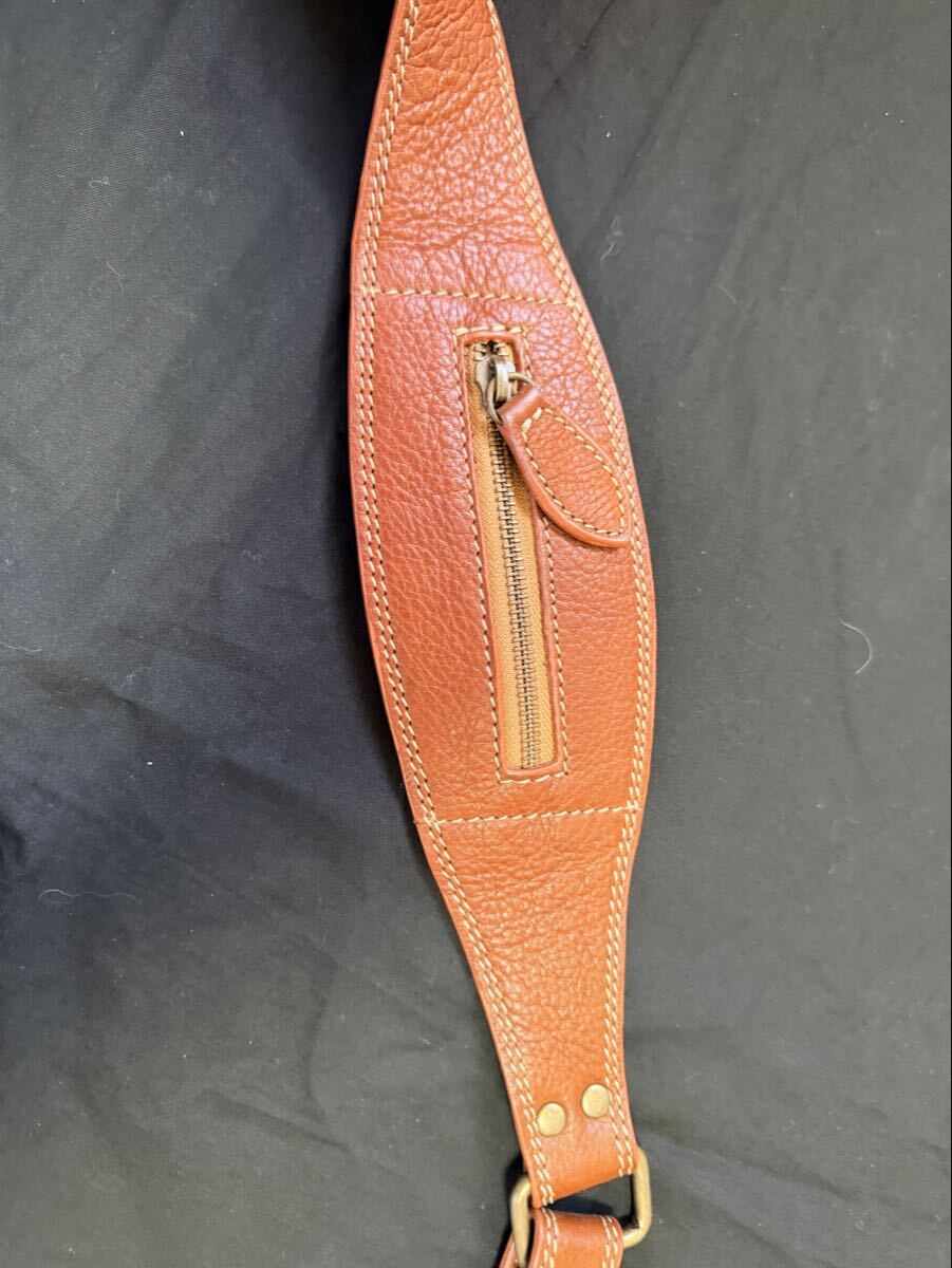 ブラウンのレザー製スリングバッグ、2つのファスナー付きポケット。