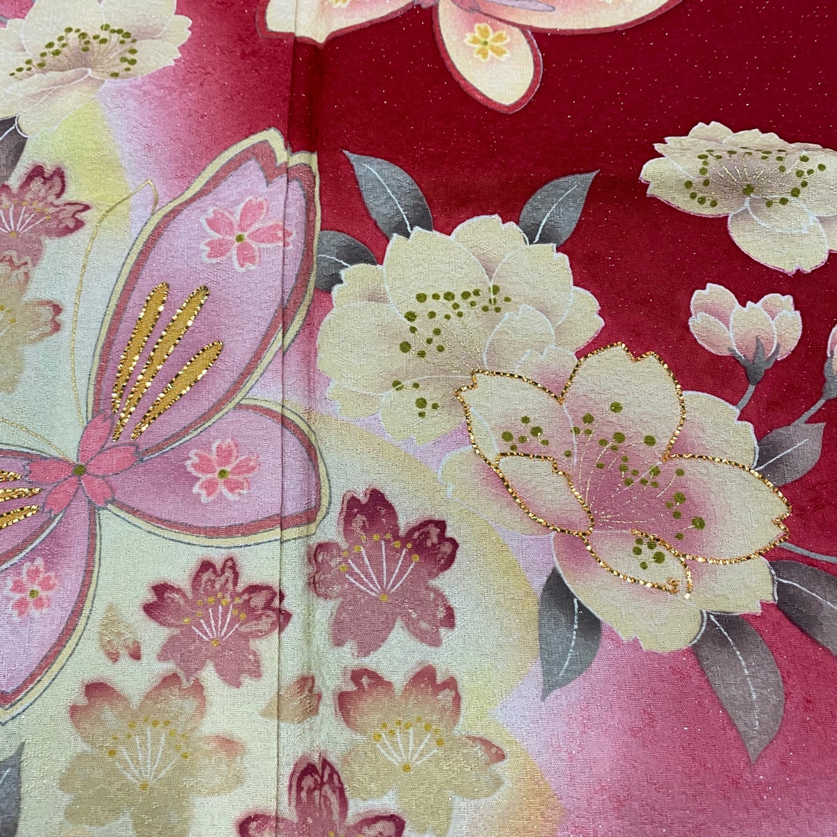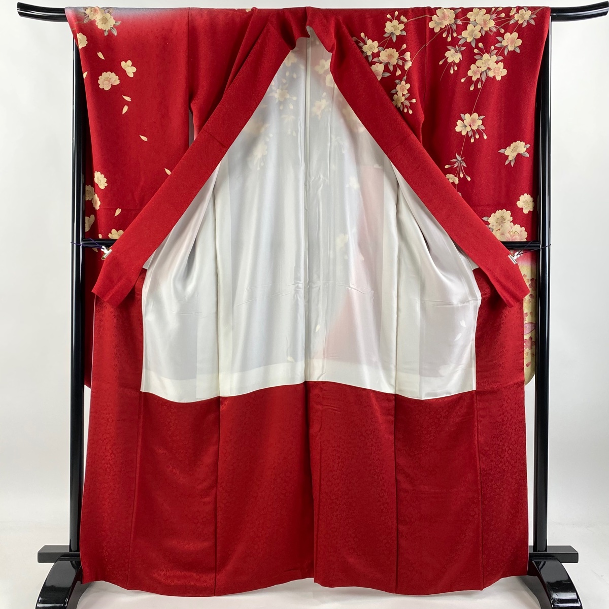 振袖 名品 蝶 桜 銀通し 金彩 赤 袷 身丈166 裄丈68 L 正絹 【中古】 |