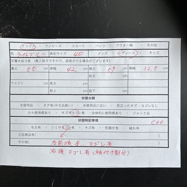 ・シミやヨゴレ有(右後ヨゴレ有(袖付け部分))