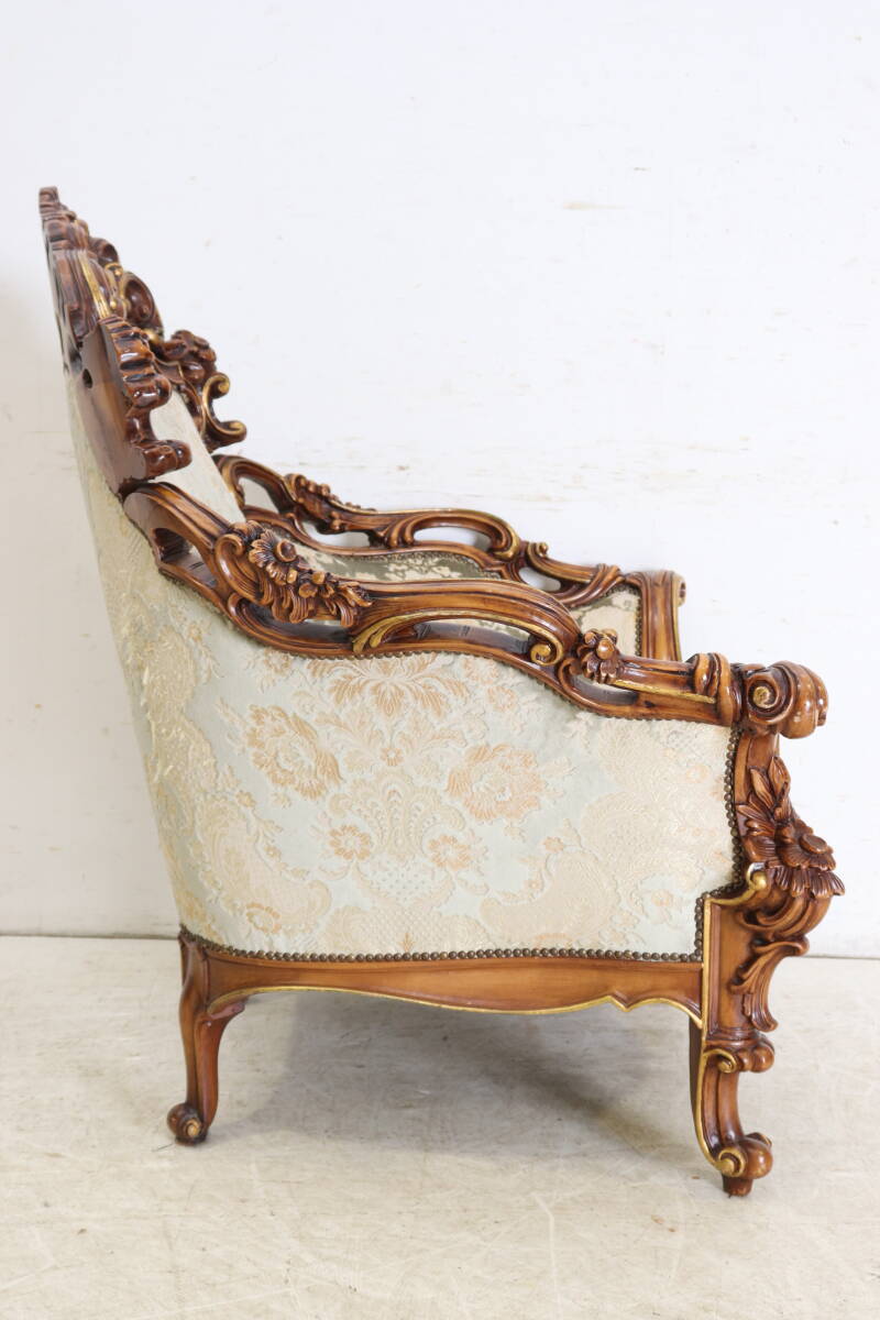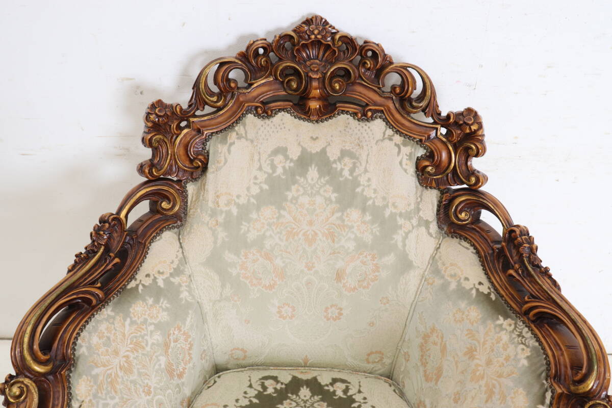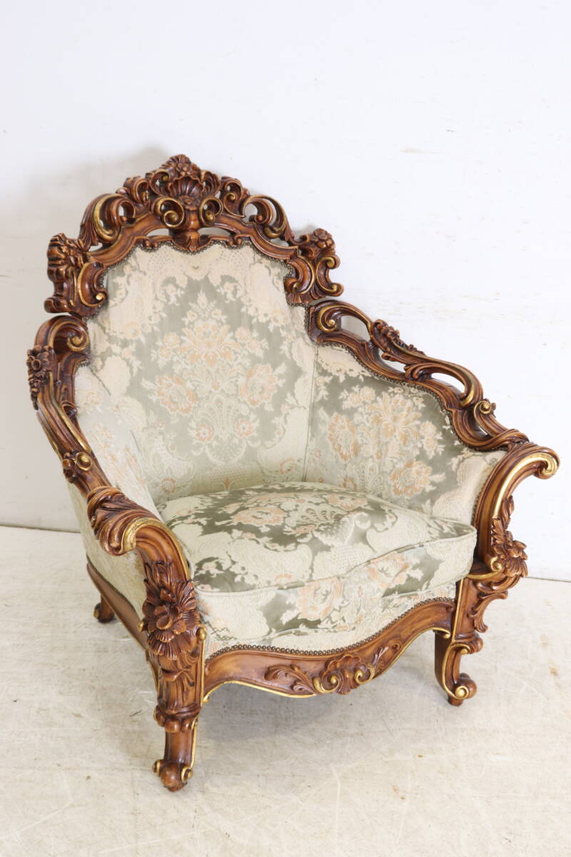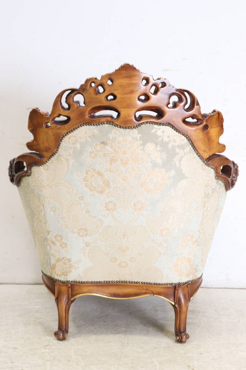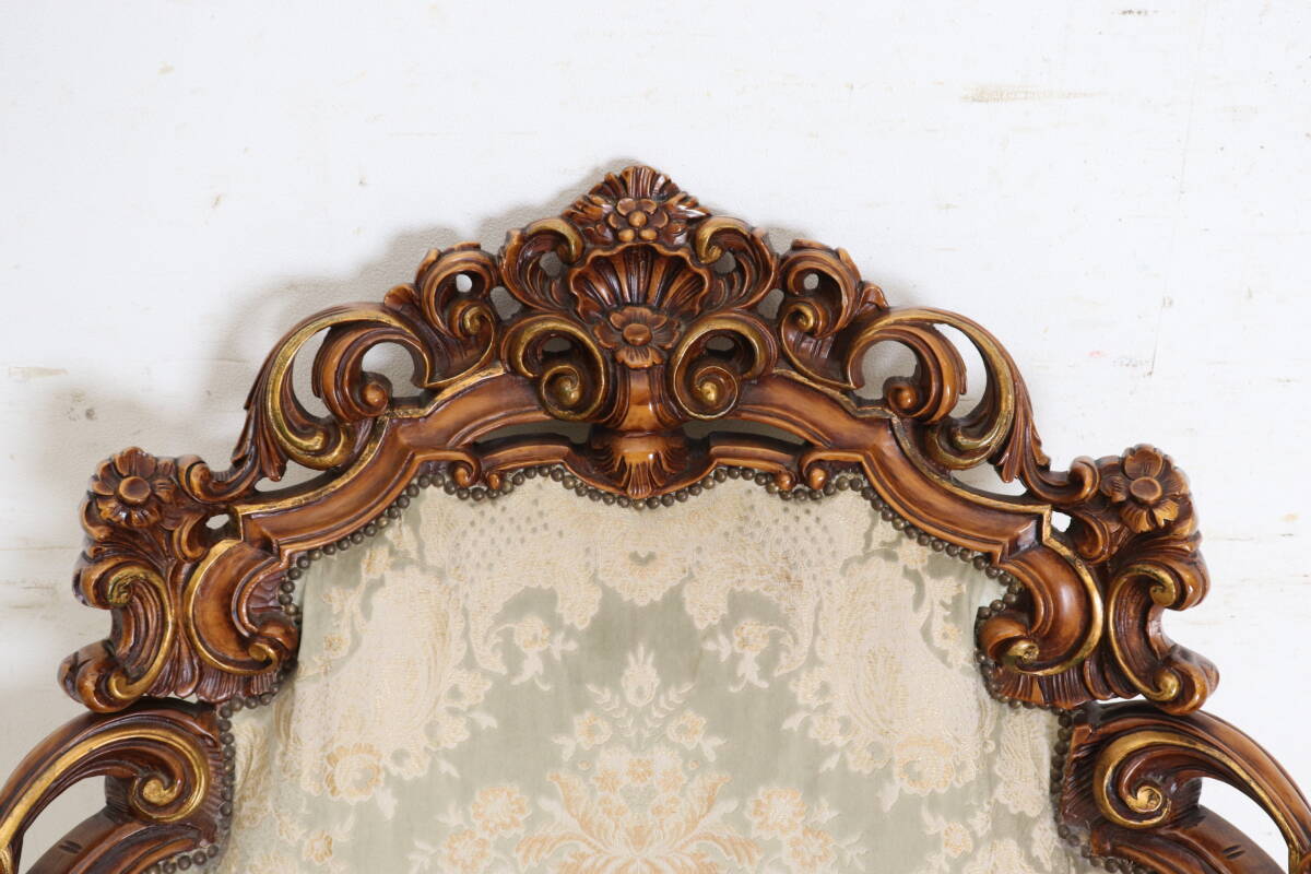 優雅な曲線と華やかな彫刻装飾が施されたフレームは、ロココ様式を思わせるクラシックな佇まいで、お部屋に一脚置くだけで格調高い雰囲気を演出します。