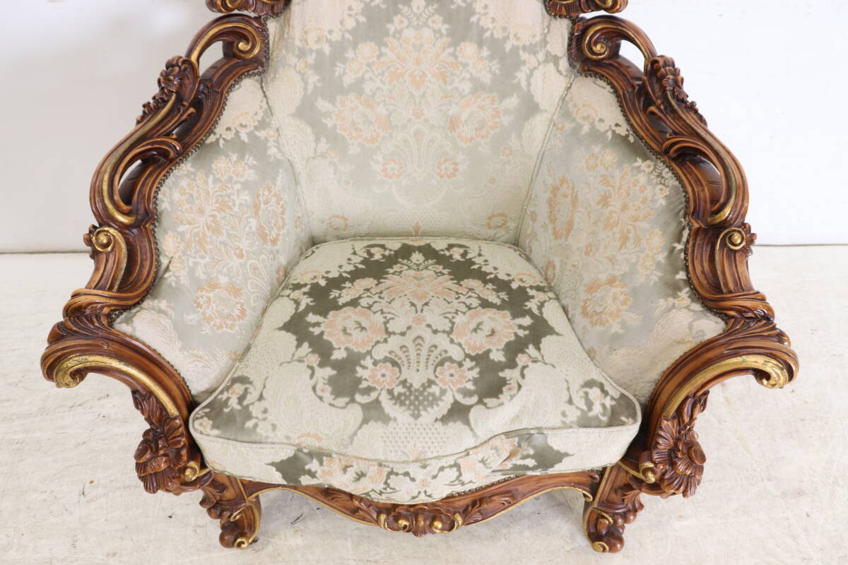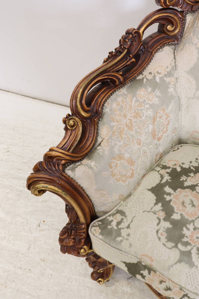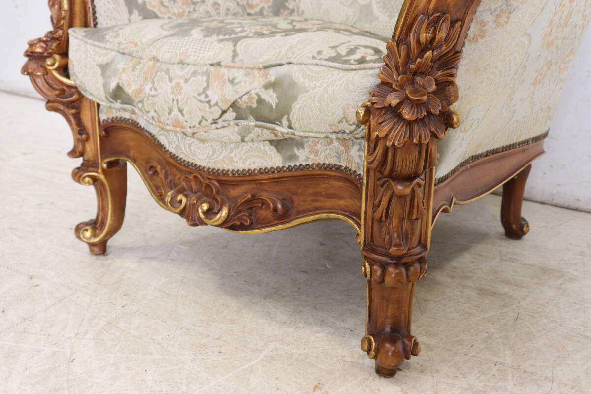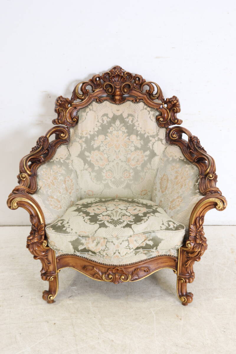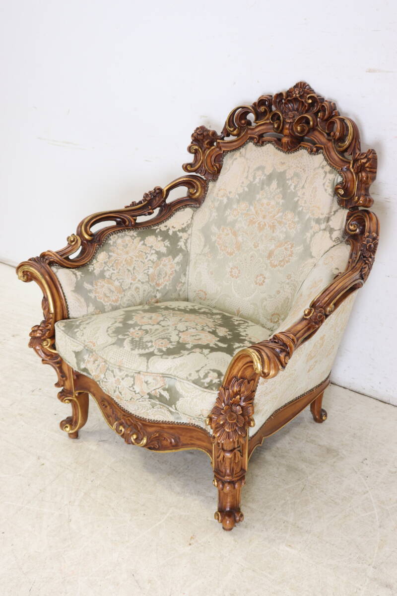 優雅な曲線と華やかな彫刻装飾が施されたフレームは、ロココ様式を思わせるクラシックな佇まいで、お部屋に一脚置くだけで格調高い雰囲気を演出します。