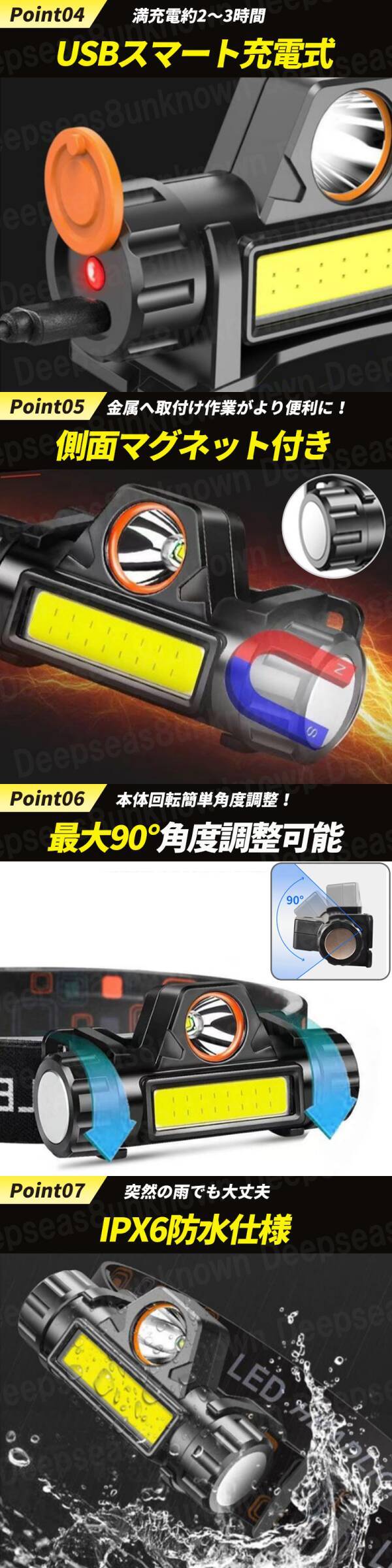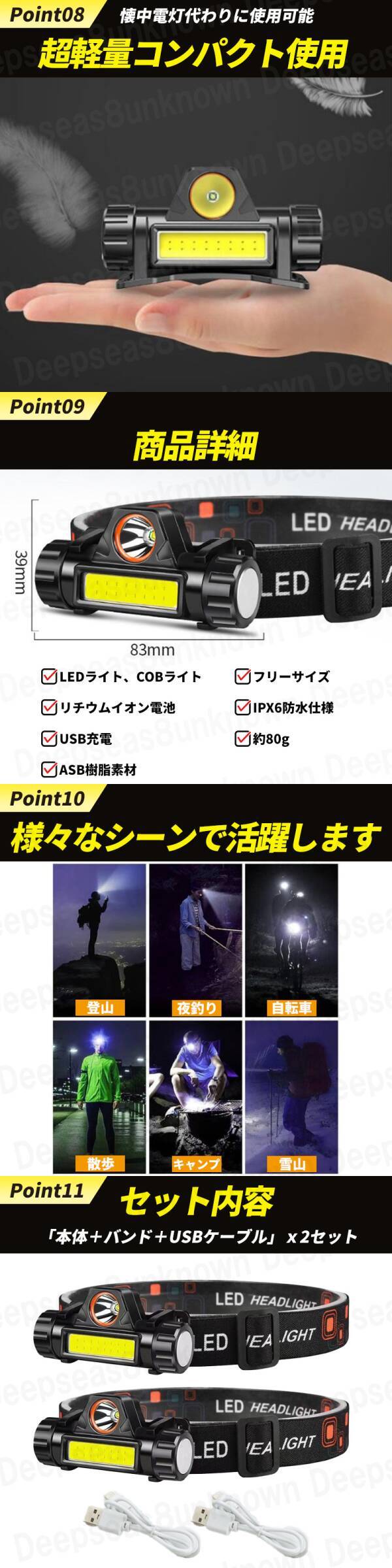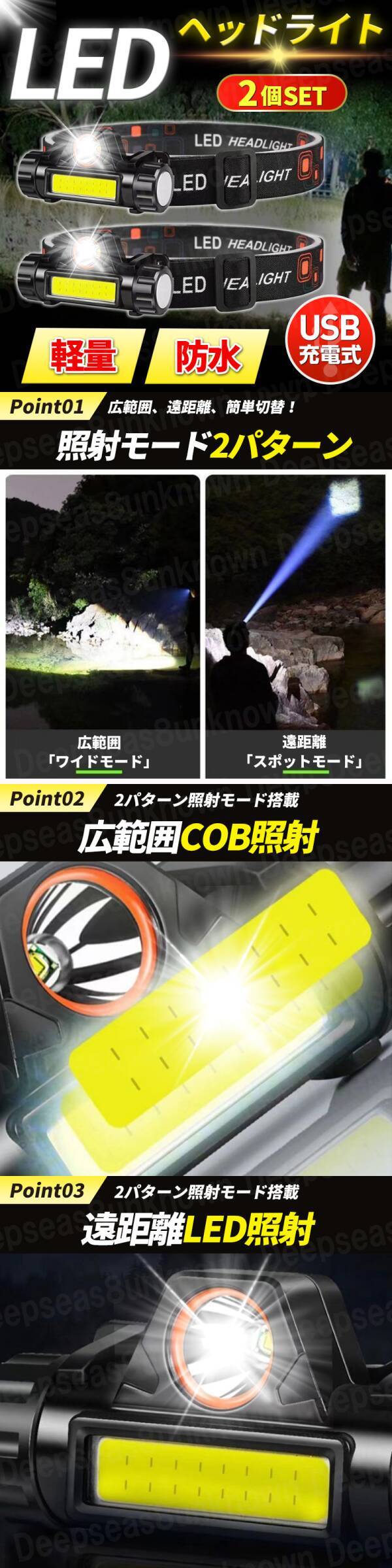 | LED ヘッドライト 充電式 スポットライト 小型 懐中電灯 usb cob 防水 ワークライト 登山 キャンプ 夜釣り 夜間 作業 マグネット 軽量2個 |