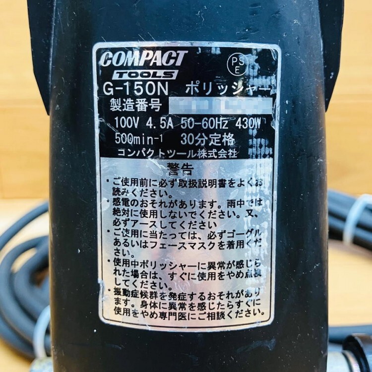 | 管理番号:1100000111621 メーカー:COMPACT TOOL/コンパクト・ツール 型番:G-150N 規格・仕様: 【仕様】 ●回転数(RPM):500RPM ●電源(V):100V ●電流(A):4.5A ●入力(W):430W ●パッドサイズ(mm):φ123 ●バフサイズ(mm):φ150 ●寸法(mm):Wφ123×H187×L248 ●コード(m):5m ●重量(kg):1.8kg 詳細備考: 清掃動作確認済みです。 キズや割れ、取り切れない汚れなど使用感があります。 ※同程度の商品を複数所有しており、画像は併用しています。 商品は写真に写っているもので全てです。(※背景などにある無関係の物は含まず) 他に付属品はありません。 ご質問はお気軽にどうぞ。分かる範囲でお答えします!! ※上記は型番などから調べたデータを抜粋したものです。 |