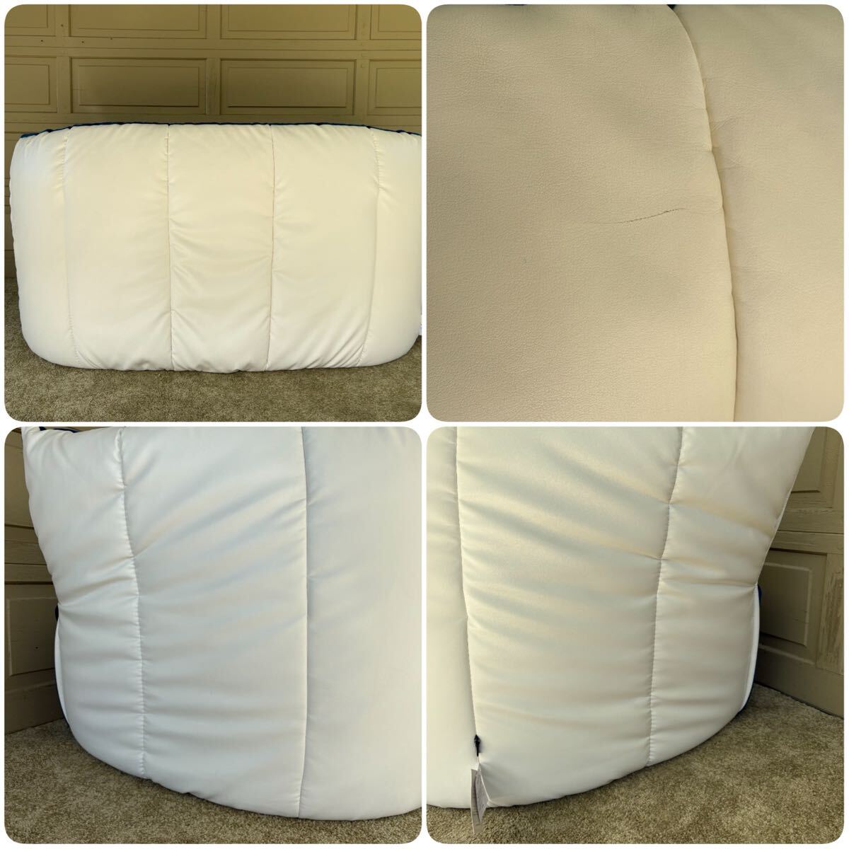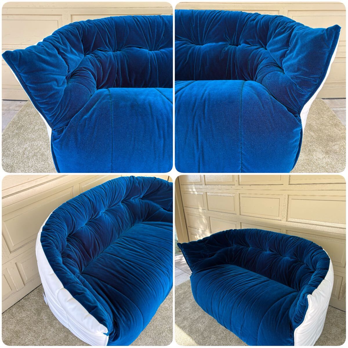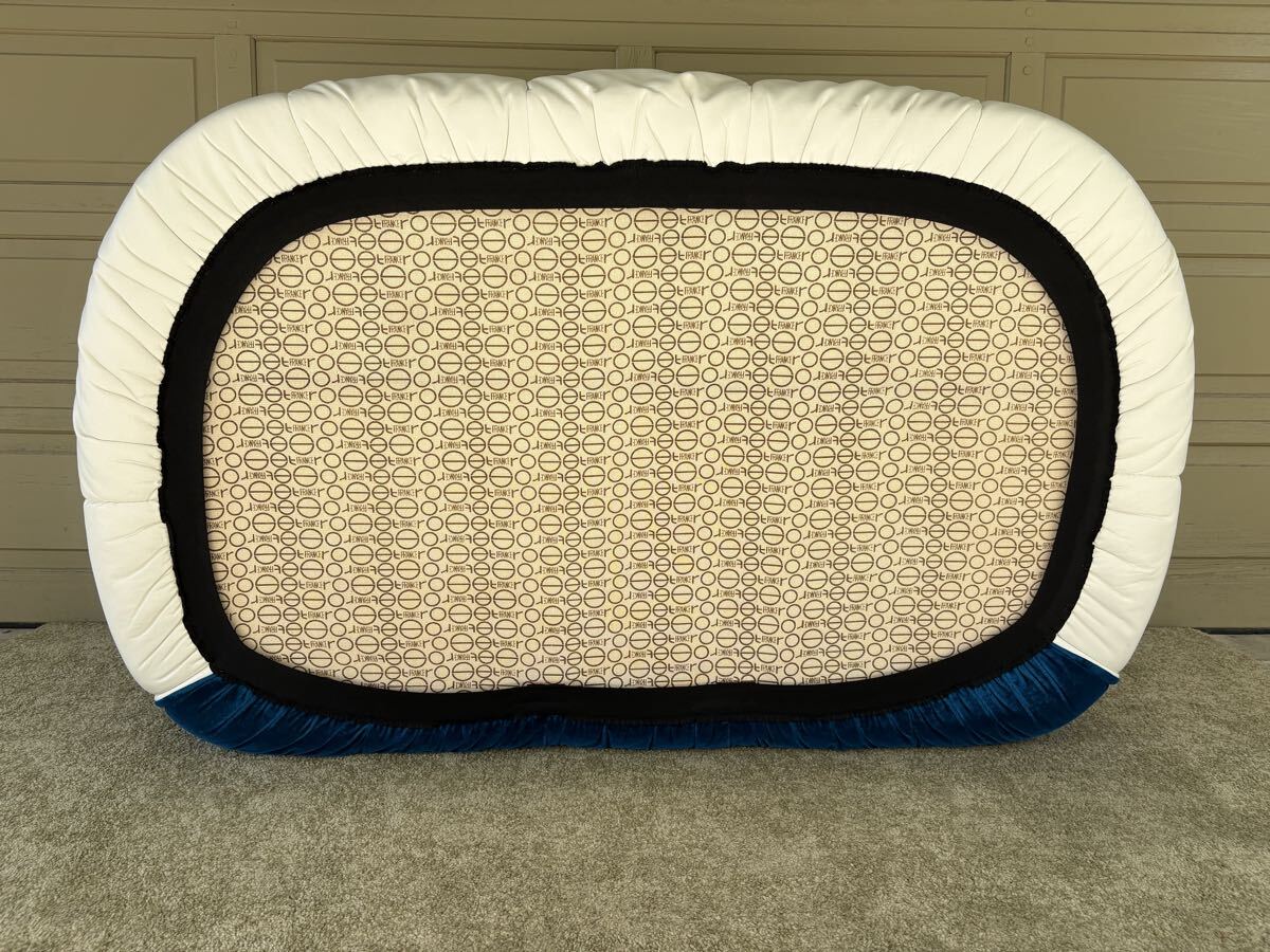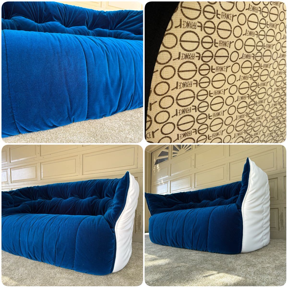 本品は特に希少な ロイヤルブルー × ホワイトの張り分け仕様。アートピースのように空間を引き締めるカラーリングは、コレクターやデザイン家具をお探しの方に強くおすすめいたします。