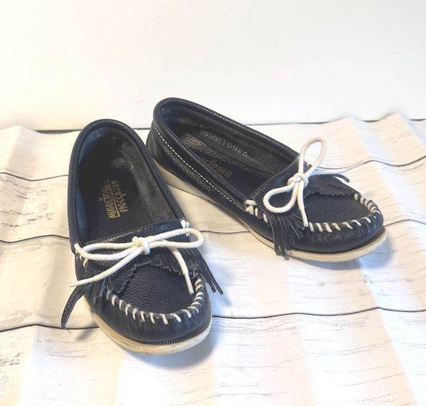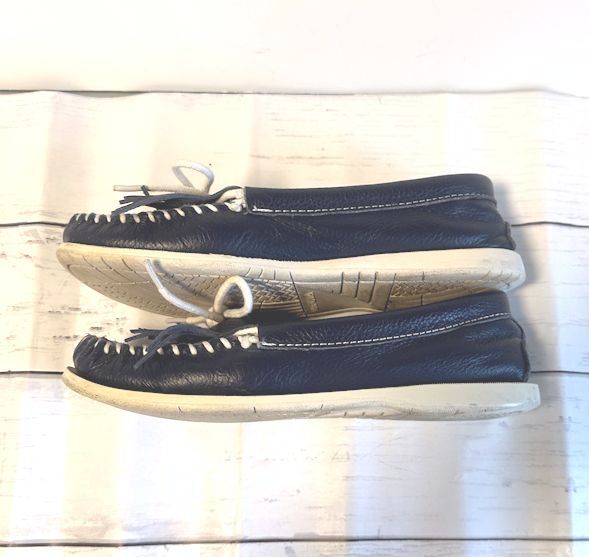 MINNETONKA ミネトンカ★フリンジ・レザー・モカシン・ネイビー×ホワイト・6/23cm★美品
