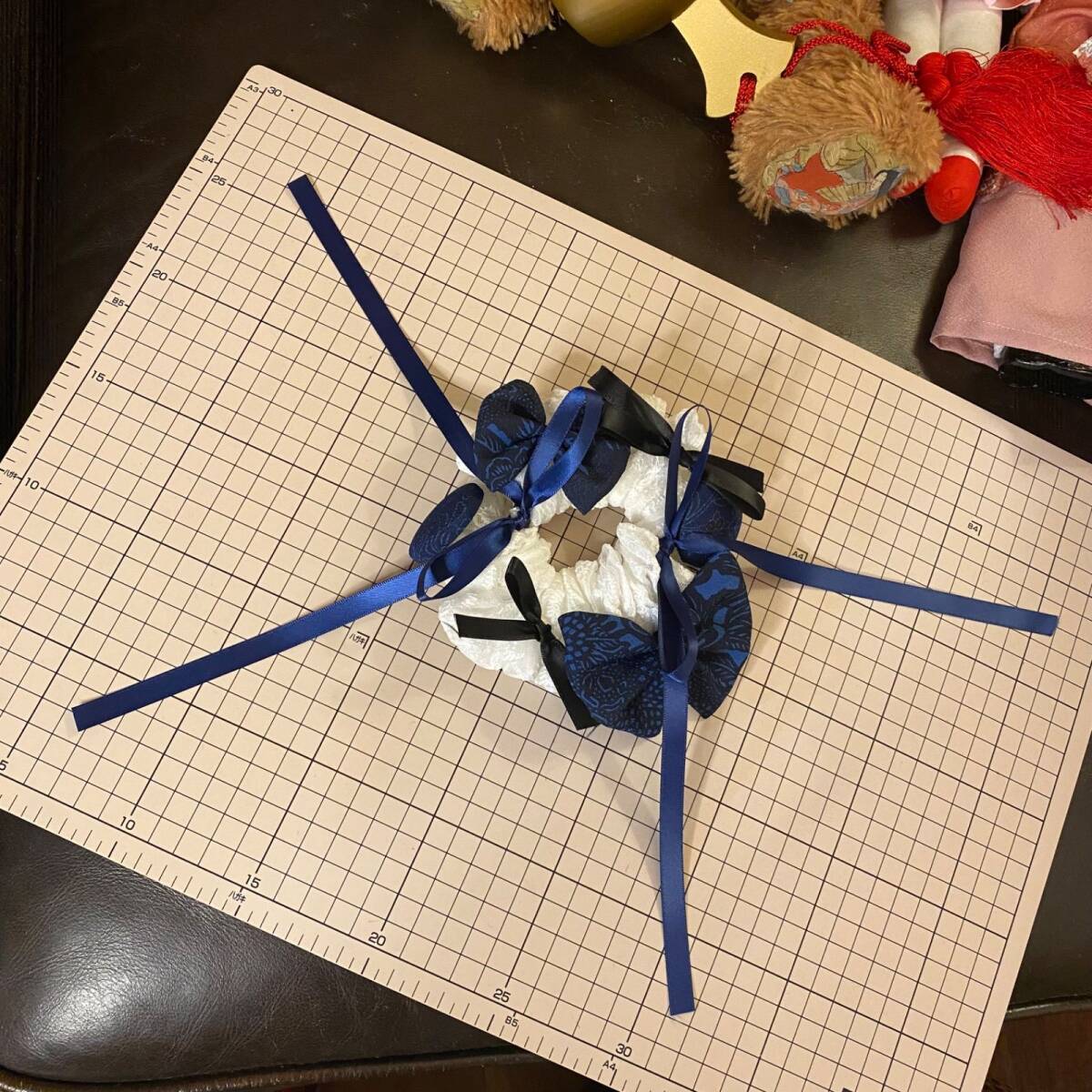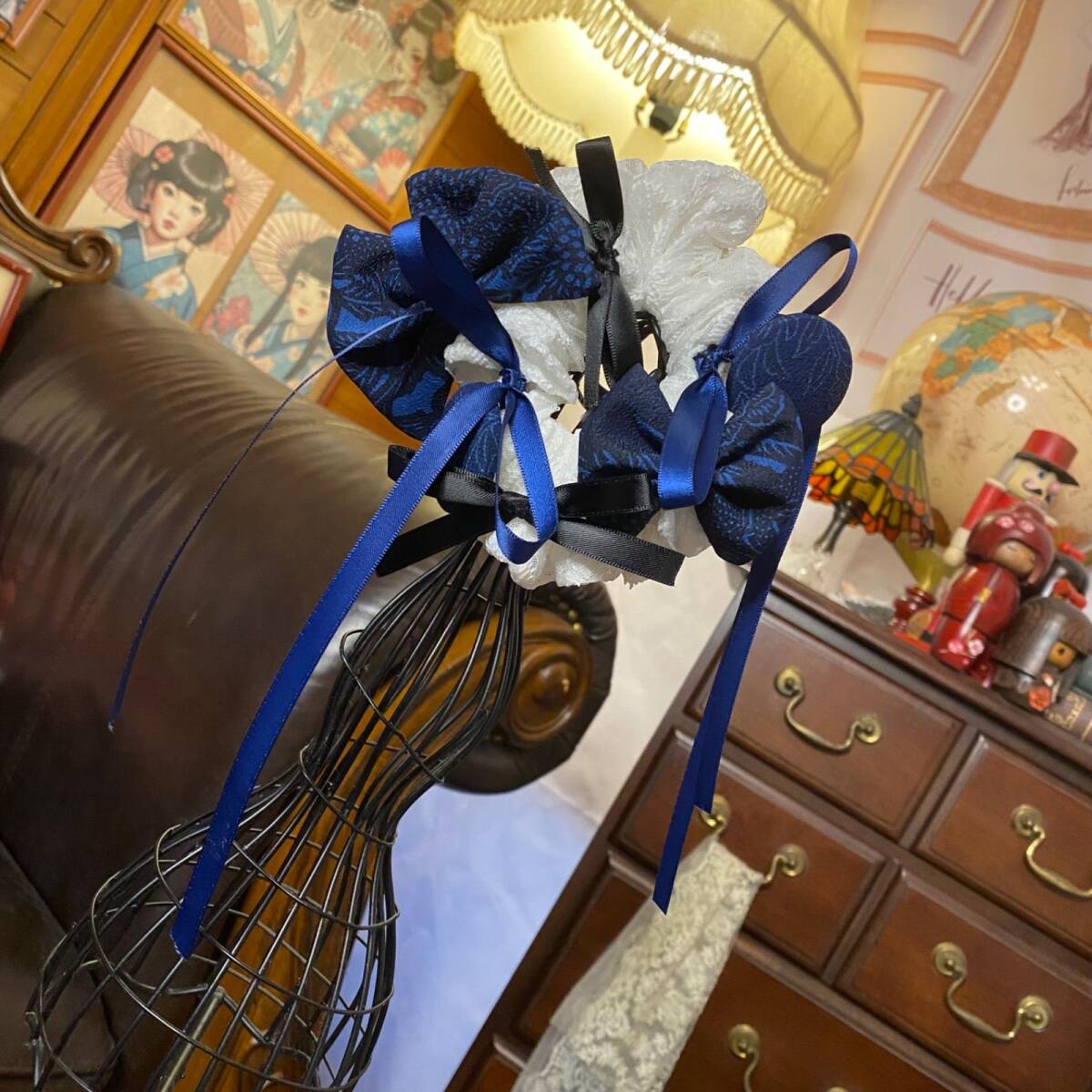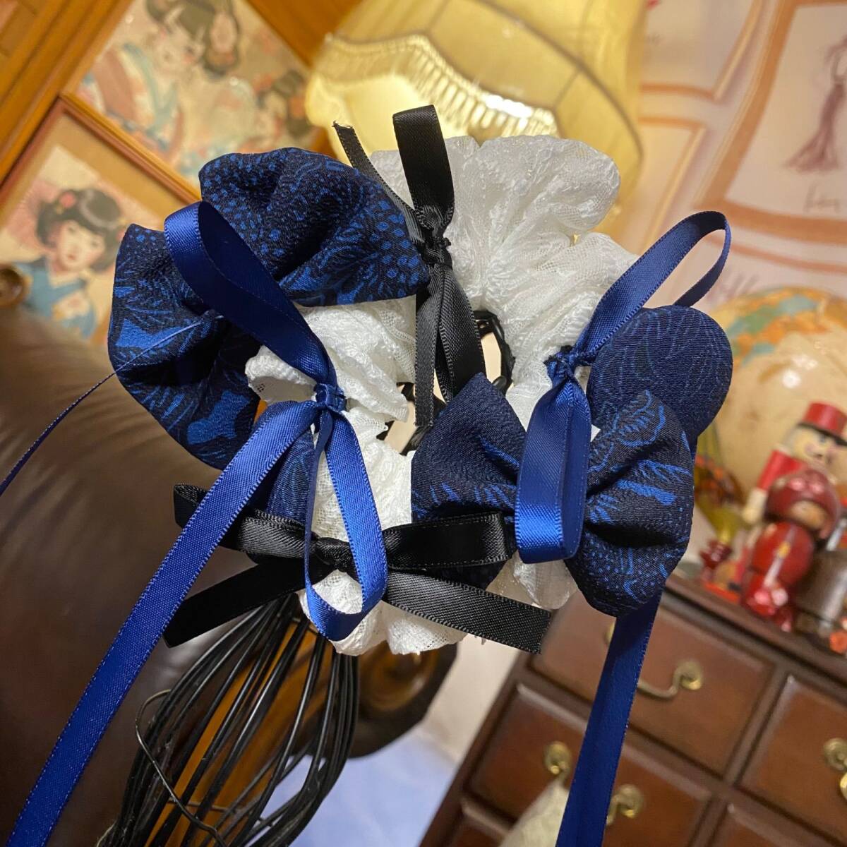 深い藍の唐花地紋着物地と、霜を纏ったような白レースを合わせたシュシュ。艶やかなロイヤルブルーのサテン&黒リボンがきゅっと締め、光の角度で文様がふわっと浮かびます。清楚とモードを一度に叶える、和×クラシックな一点。