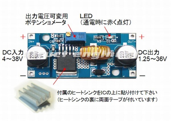| 降圧型のため、電圧を上げる事はできません。 最大定格を超えてご使用は、故障の原因となりますのでお止め下さい。 故障の原因となりますので、ヒートシンク部分を覆わないで下さい。 製造時期により、使用されている部品などが写真と異なる場合があります。 電気性能や使用方法は同じですのでご了承下さい。 |