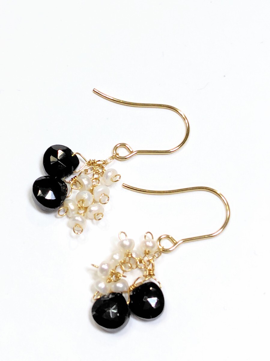 ブラックスピネル(マロンカット型)6mm、淡水パール(ボタン型)2×3mm、ピアスフックはサージカルステンレス、チェーンはメッキ、ワイヤーは真鍮(ゴールドカラー)