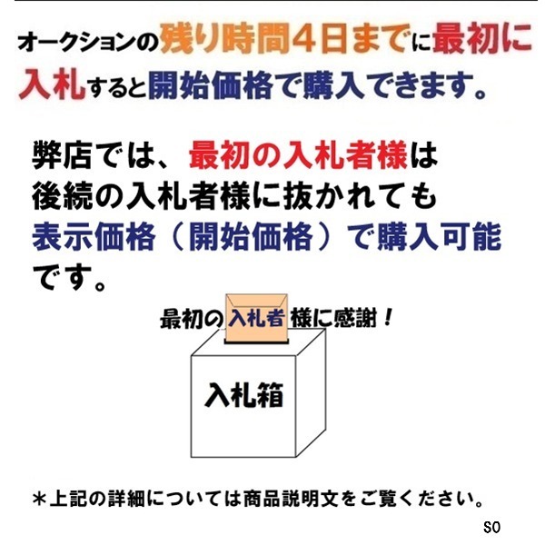 弊店では、オークションの残り時間4日までに最初に入札したお客様は、後続の入札者様に抜かれても開始価格で購入可能です。