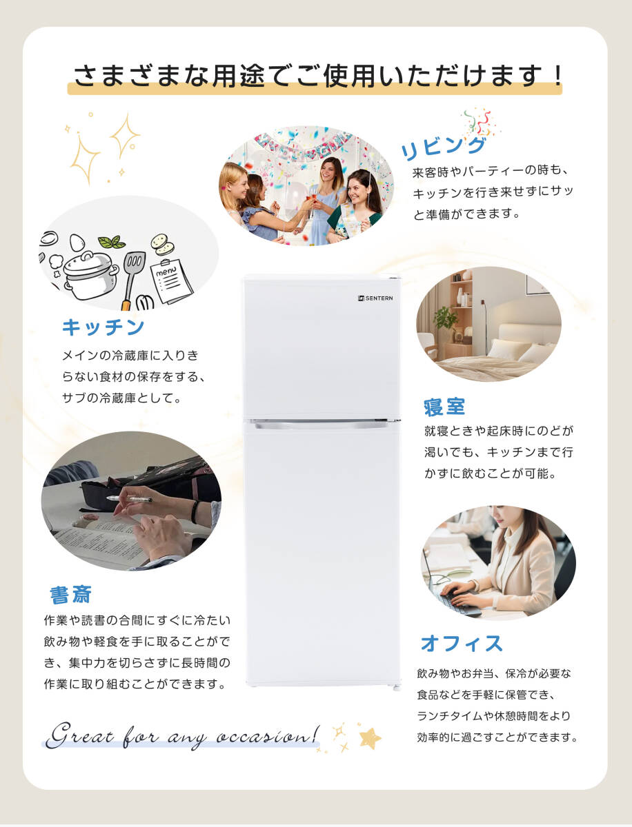 • 【冷蔵+冷凍、2ドア構造で使い分けができて便利!】 冷凍食品・ドリンク・作り置きなど、必要なものだけをコンパクトに収納。一人暮らしはもちろん、二人暮らしのサブ冷蔵庫にも最適