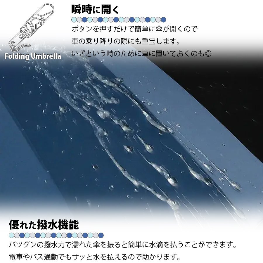 | ・ボタンを押して自動開閉できる折りたたみ傘です。 ・急いでいる時もボタンを押すだけで開閉できるのでとても便利! ・強風にも負けないカーボンファイバーの16本の骨組み。 ・直径約106cmの大きめサイズで荷物が多くても濡れにくい!2人でも使えます。 ・撥水機能で軽く振ると水滴が落ちます。 ・車の乗り降りもボタン一つで操作できるので楽ちんです。 ・晴雨兼用なので日傘としても使えます。 ・カラーは4色展開。ベージュ・グリーンは明るめカラーで可愛いカラーです。 |