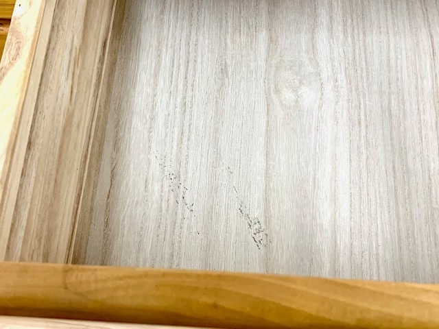 引出し小の持ち手のあたりにキズあり、右上あたりに汚れがあります。また、中に汚れている所あります。