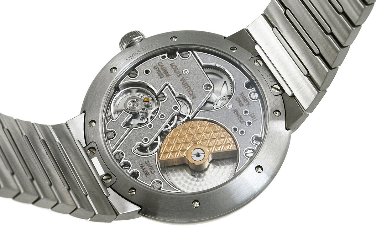【コメント】 2002年に誕生したルイヴィトンを象徴するウォッチ・コレクション「タンブール」。2023年に登場したモデルで、ラグ一体型ブレスとなったデザインが特徴的です。ルイヴィトン自社製ムーブメントCal.LFT023を搭載しています。ケースエッジ部分34分位置に僅かな小キズがあります。その他使用に伴う多少の擦りキズはありますが目立つ様な深いキズはありません。2025年1月に国内正規店にて購入品で、現在精度は平置きで日差+8秒程です。