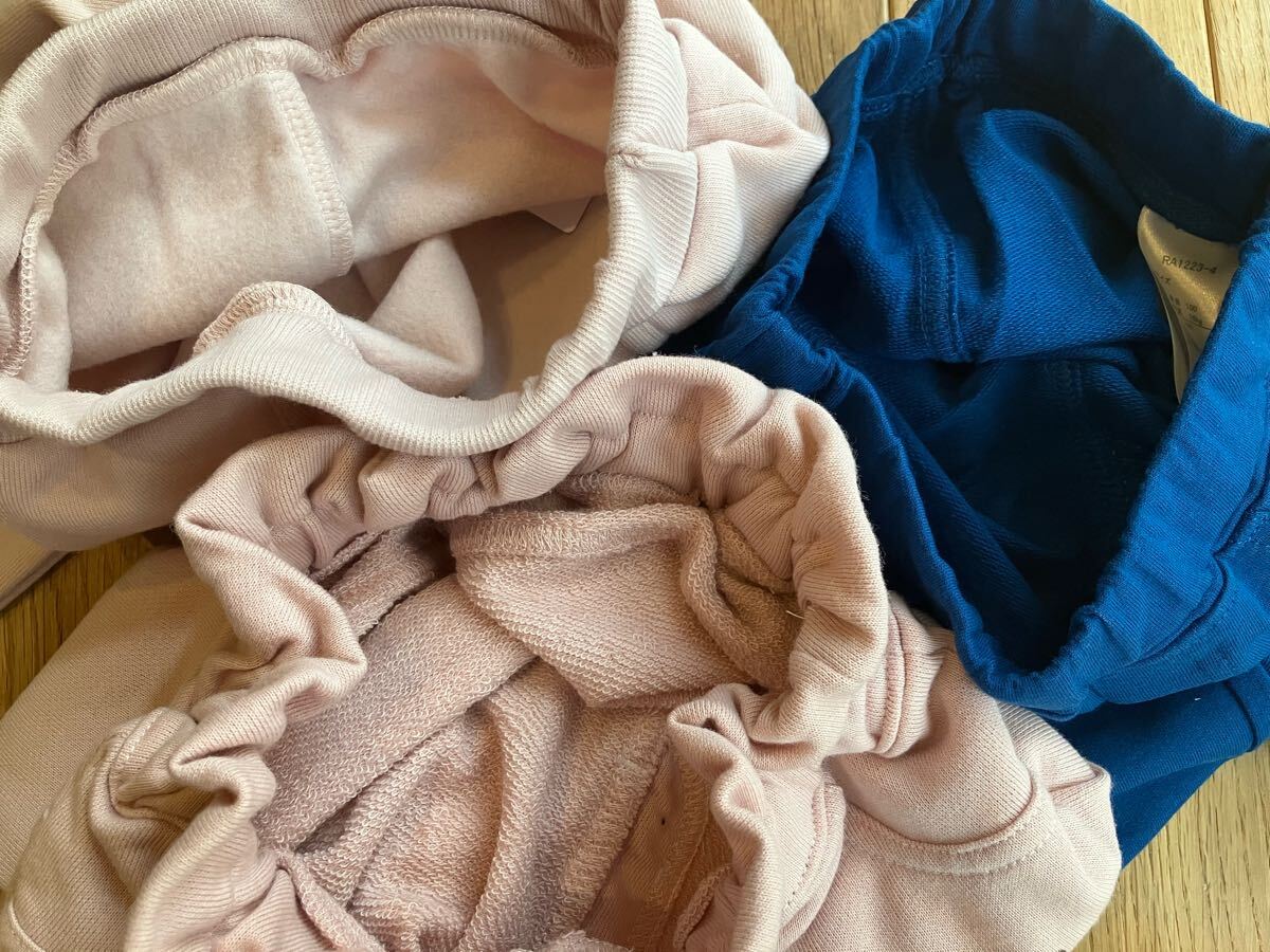 一番左のピンクは裏起毛、真ん中のピンクは普通の起毛、ネイビーブルーは薄手の通年素材