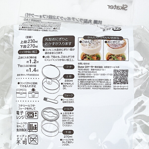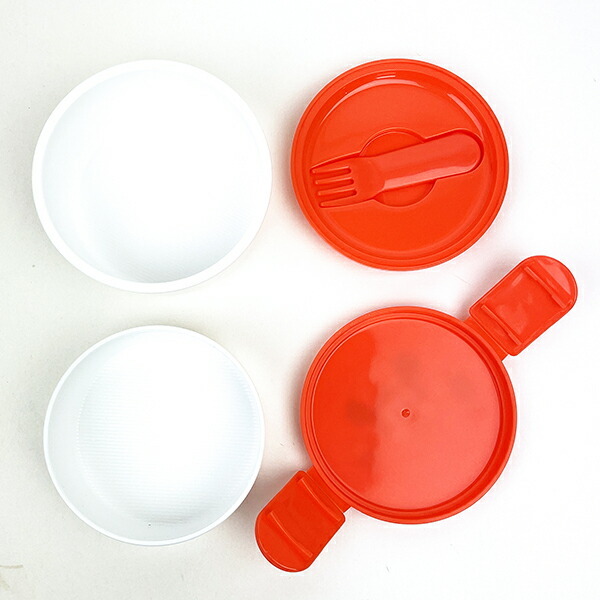 商品説明 | 小さな丸型のシンプル2段お弁当箱♪コンビニ丸型おにぎり1個が袋のまま入ります◎上段、下段とも、ごはんがつきにくい『くっつかない加工』が施されています。内蓋収納フォーク(プラスチック製)付き!食べ終われば1段に収納できます!フタ、シールフタ、フォークを外して電子レンジ対応可◎シールフタ以外は食洗機対応可◎※ロック式ですが、パッキンは付いていませんので汁気のある食材はお避け下さい。 |