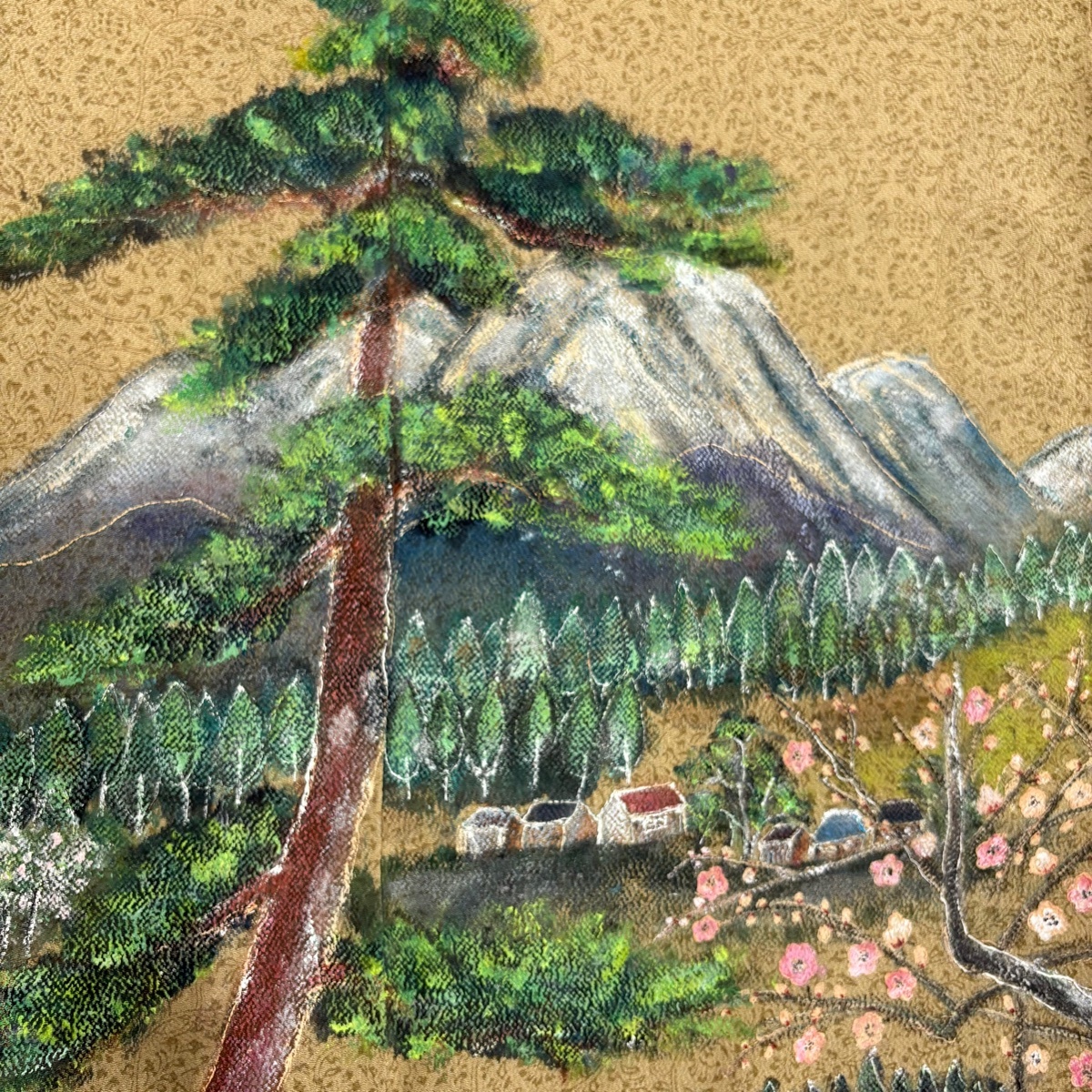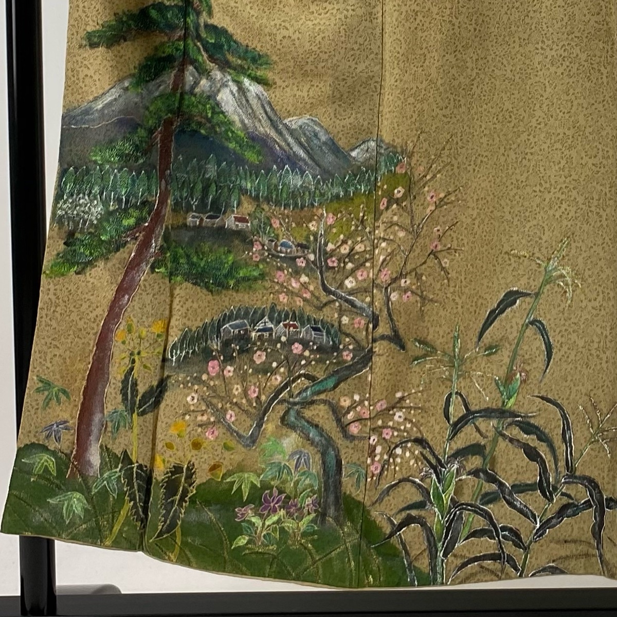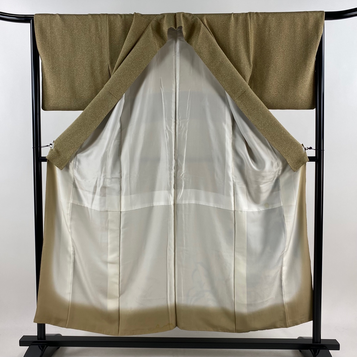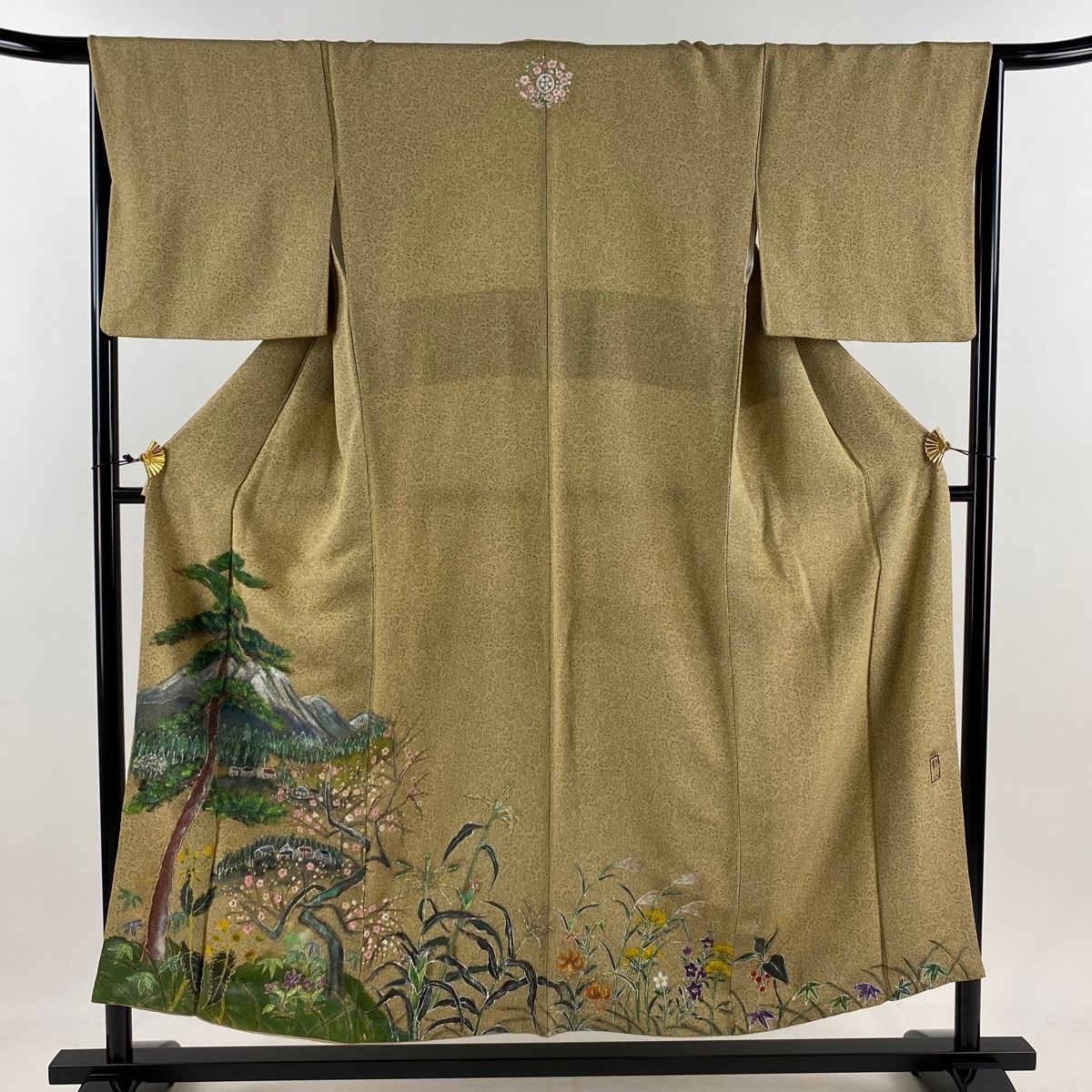 | 付下げ 秀品 落款 風景 山並み 金銀彩 薄茶色 袷 身丈152 裄丈66 M 正絹 【中古】 |