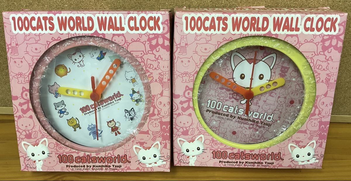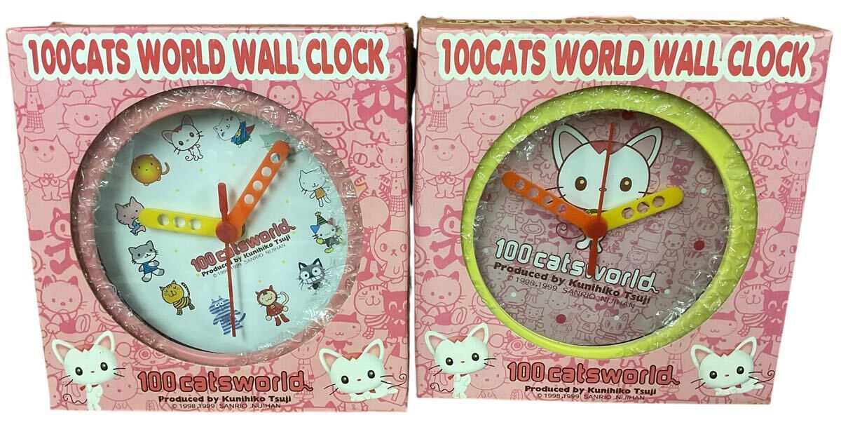 当時物 未使用 保管品 サンリオ 100catsworld Kunihiko Tsuji ウォールクロック 壁掛け時計 2個 セット 昭和レトロ 1990年代 コレクション