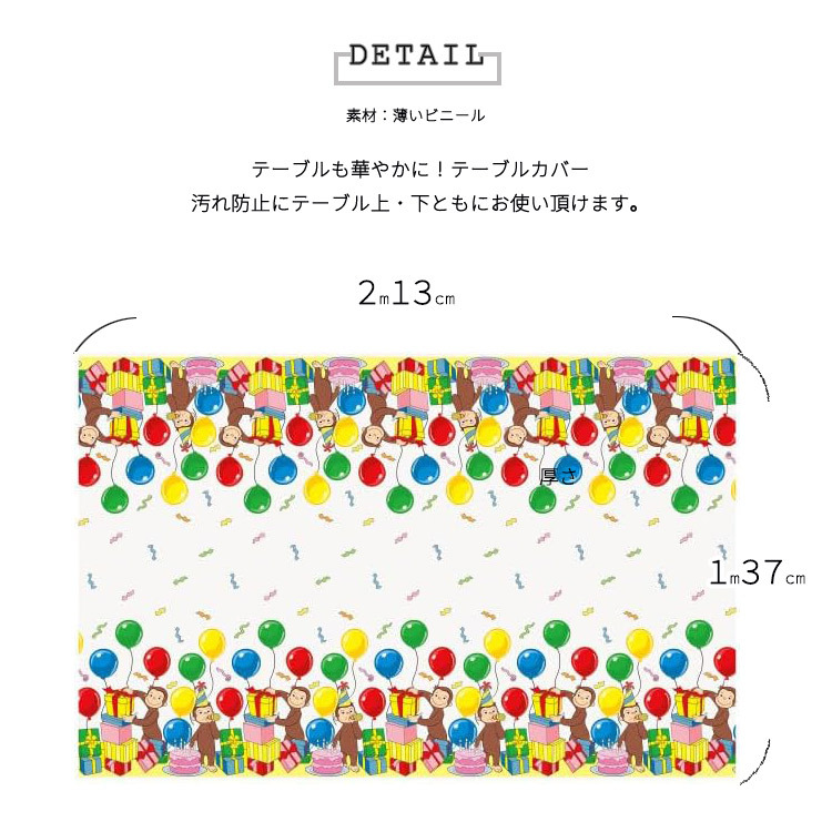 | 仕様 | テーブルコーディネートを一層華やかに。 「おさるのジョージ」の大判テーブルカバー 長方形のテーブルにそのままかけるだけで華やかなパーティー空間に。 汚れ防止にテーブル上・下ともにお使い頂けます。 |