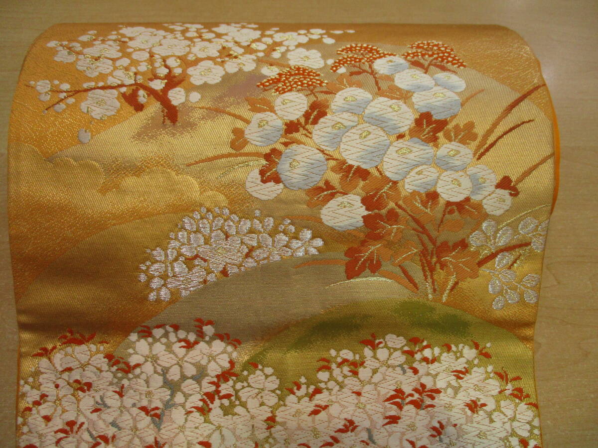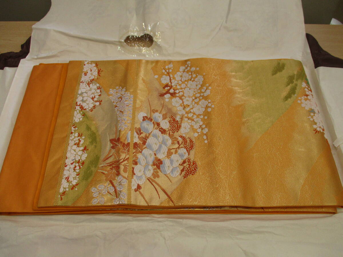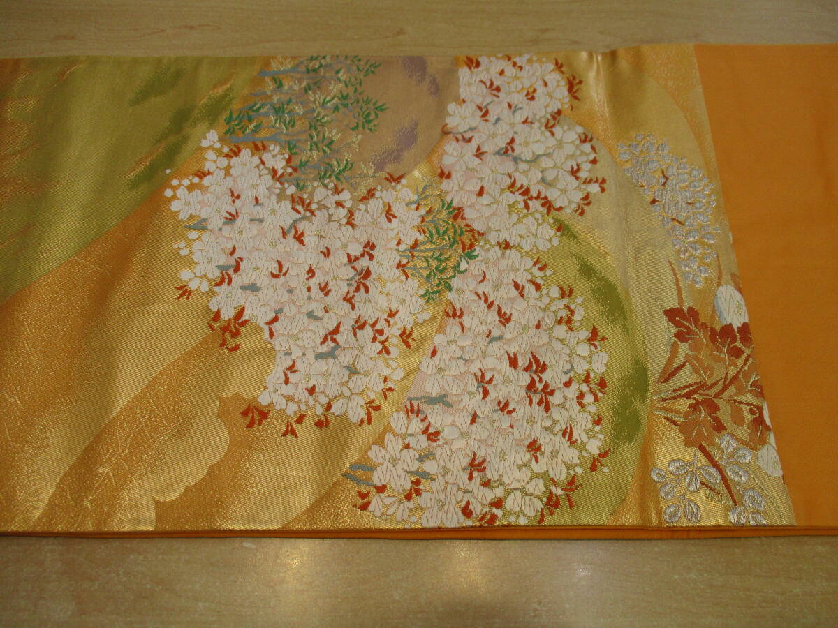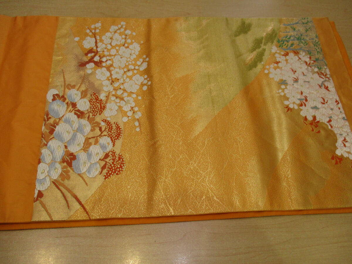 帯 和装 和服 袋帯 オレンジ色 金糸 色糸 花 豪華 華やか 可愛い 六通柄 振袖 留袖 フォーマル USED品 帯保存袋入り |