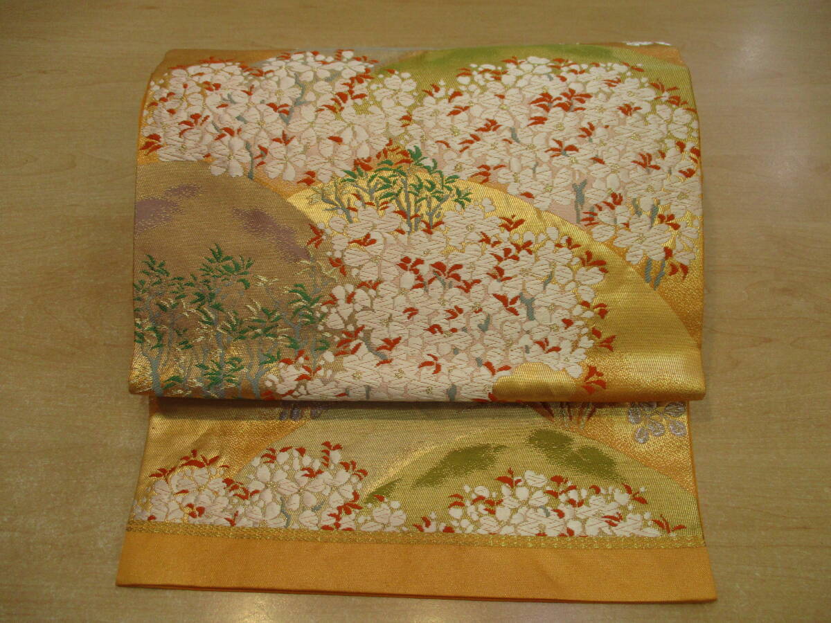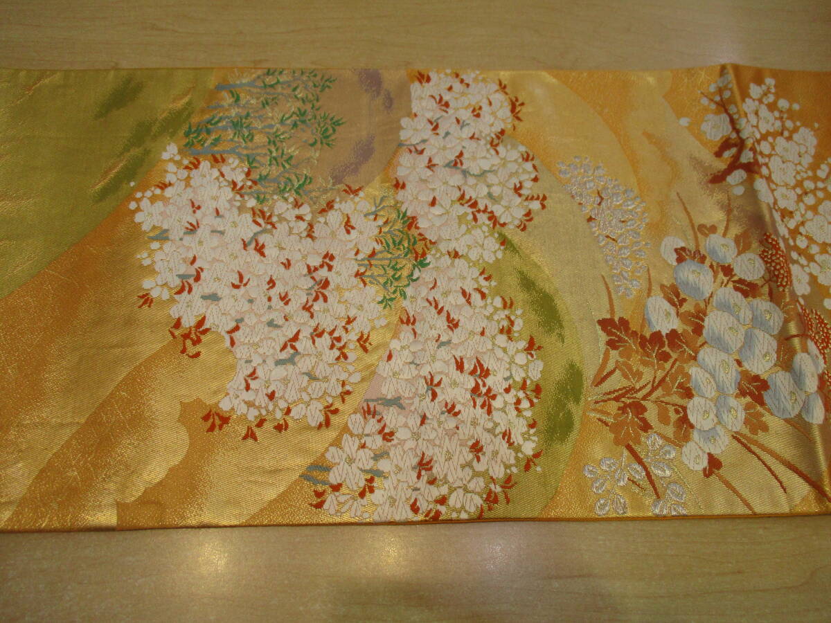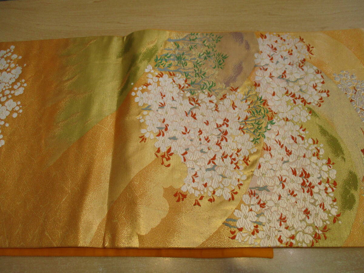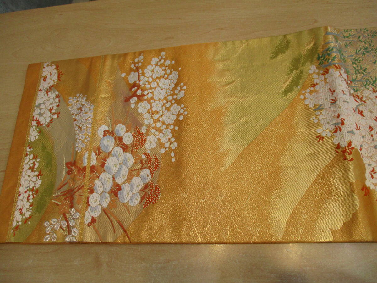 帯 和装 和服 袋帯 オレンジ色 金糸 色糸 花 豪華 華やか 可愛い 六通柄 振袖 留袖 フォーマル USED品 帯保存袋入り |