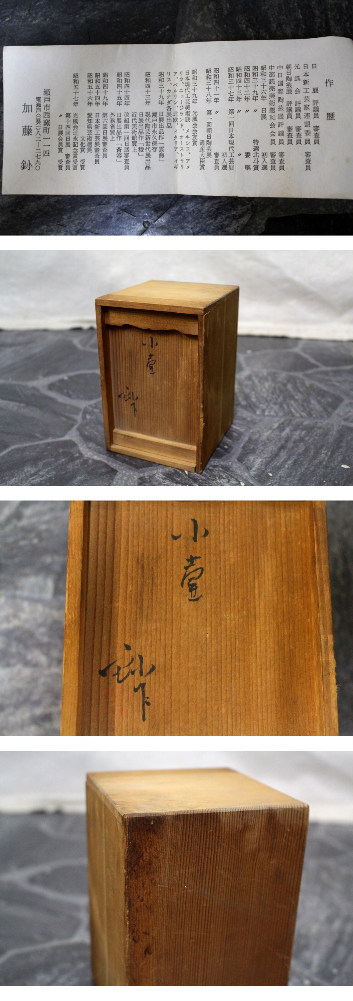 | 商品説明 | 【商品詳細】70未使用◆加藤 釥◆美濃 焼/織部◆小壺/壺/壷ツボつぼ◆柄入◆ブラック×ホワイト系◆作歴表/共箱 付◆サイズ約W9×H13㎝◆骨董/美術品の出品となります。 初めに、当方専門的知識がございませんのでご理解を宜しくお願い致します。 未使用にはなりますが一度は人の手に渡ったものとなりますので、多少の汚れ・キズ・スレ等ある可能性がございますのでご理解下さい。元々の状態かはわかりかねますが、掲載画像7枚目の通り、口部分に若干カケているような状態の部分がございますのでご理解下さい。共箱が付属しておりますが、長期簡易保管の為、取り切れない汚れやシミ、スレキズ等の使用感ございますのでご理解下さい。当方専門的知識がございませんので、小壺の詳細な状態や完品との比較等はわかりかねますので、ご理解をお願い致します。未使用にはなりますが、現状で直接手に触れられる状態の為、状態ランクはBランクとさせていただきます。掲載画像をご確認の上、価値のわかる方、ご理解いただける方のみ、画像での判断でご検討下さい。 画像にあるものが全てになります。 商品は全てくまなくチェックしていない為、当方では発見できない破損ヶ所、欠損ヶ所がある場合がございます。画像で判断して頂き、少しでもご不安が残る方はご入札をお控え下さい。出来る限りご質問にはお答えさせて頂きます。極端に神経質な方、新品をお求めの方は入札をご遠慮下さい。以上の事をご理解頂ける方のみお願い致します。ノークレームノーリターンで宜しくお願い致します。 ※素人撮影の為、写真と実物のカラーが多少事なる場合がざいますのでご了承下さい。 【サイズ】(約) 直径 9㎝ 高さ 13㎝ 口径(内径)2.7㎝ ※あくまで素人寸法となりますので多少の誤差はご了承下さい。 ●状態ランク・・B 【状態ランク説明】 A・・・新品(未開封、未使用品) B・・・未使用品(開封済みですが未使用) C・・・中古(使用感少な目の美品) D・・・中古(多少使用感あり) E・・・中古(目立つ汚れ、キズ等有り) F・・・ジャンク品 以上の内容・画像を十分ご覧いただきご入札ご検討ください。 |