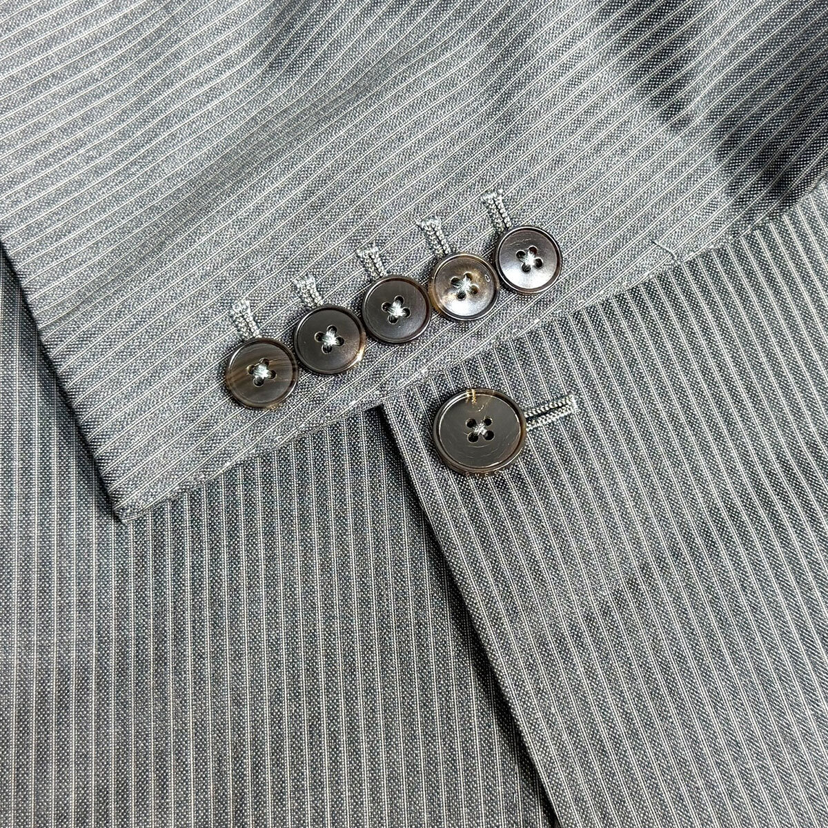 デザイン:フロント二つボタン、総裏地、センターベント、袖開き見せ。