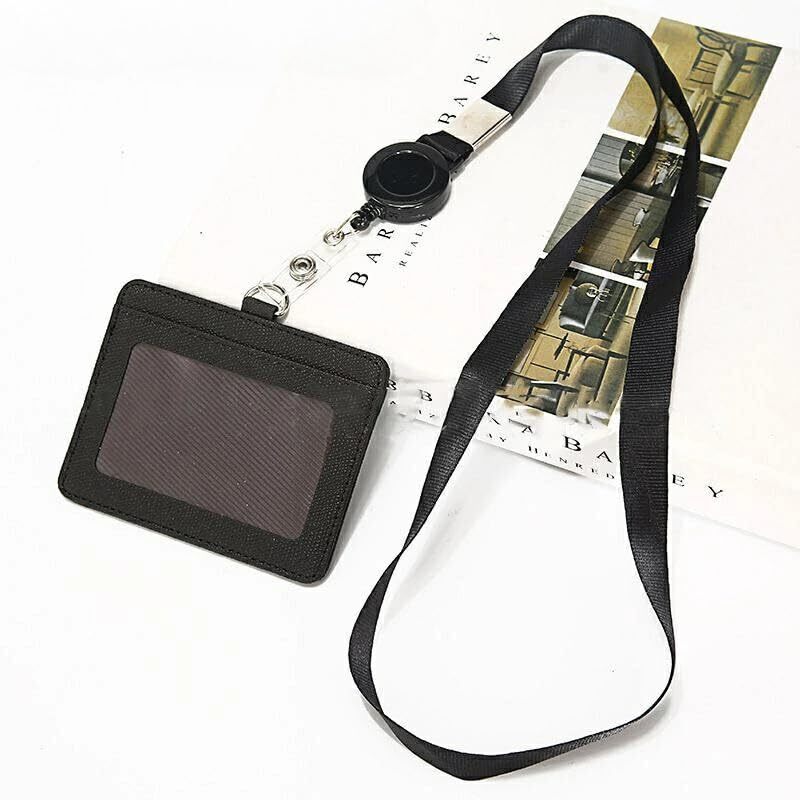 [エアステリア] パスケース リール付き 首掛け ネック ストラップ 薄型 横型 伸縮 PUレザー 定期入れ カードホルダー 社員証 名札 ICカード IDカード カードケース シンプル メンズ レディース 通勤 通学 (ブラック)
