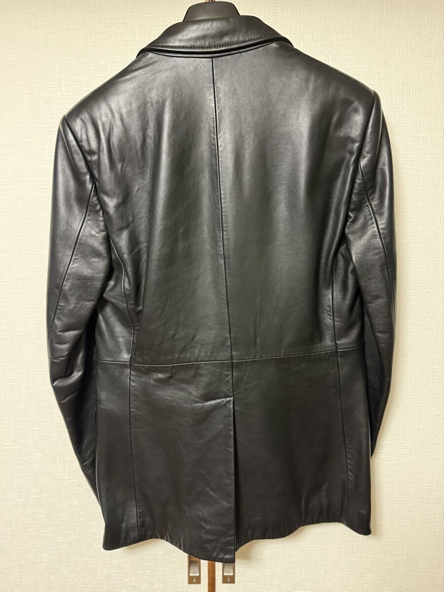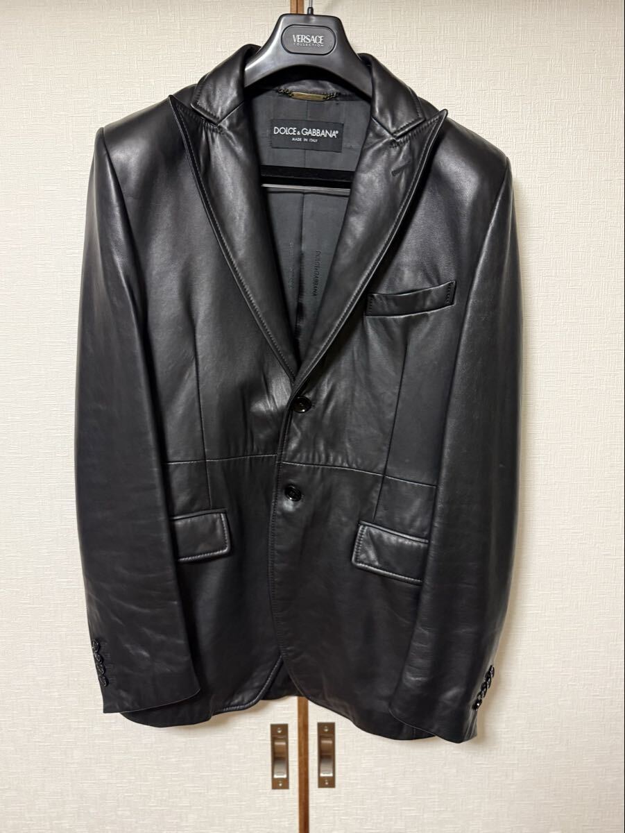シングルボタンのピークドラペルデザイン、ブラックレザーのジャケットです。