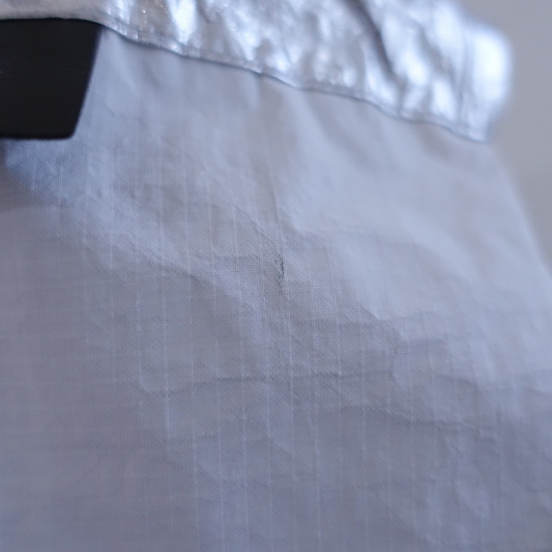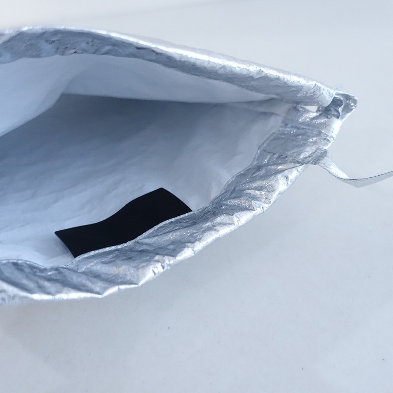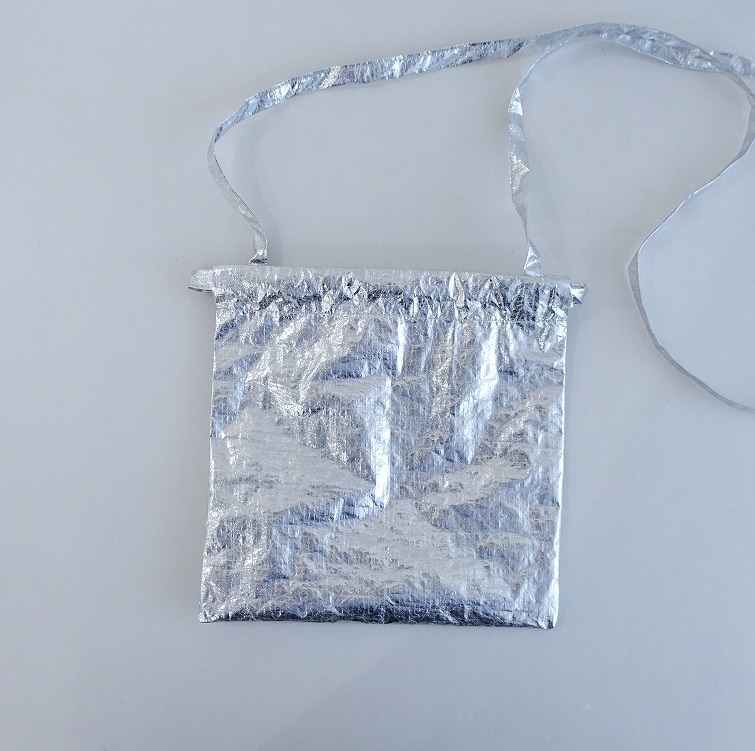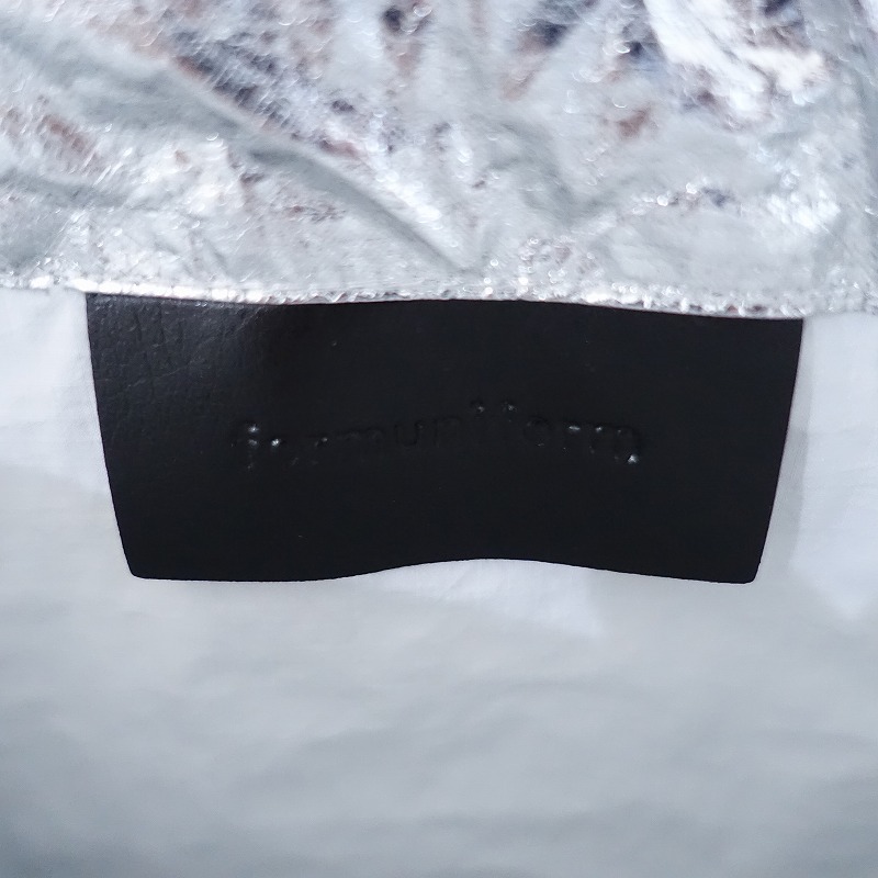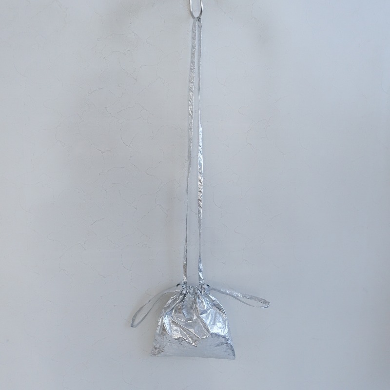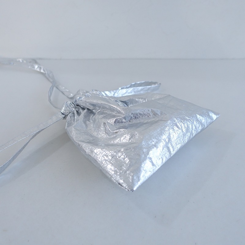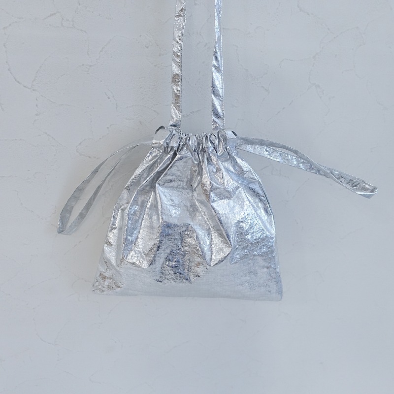 | formuniformのショルダー付巾着バッグ XS Silverです。カラーはメタリックシルバーで、撥水加工が施されたナイロン素材であしらわれており、開口部は巾着仕様です。 |