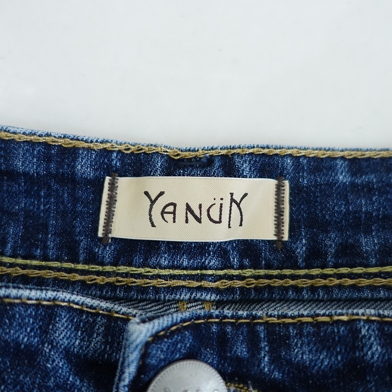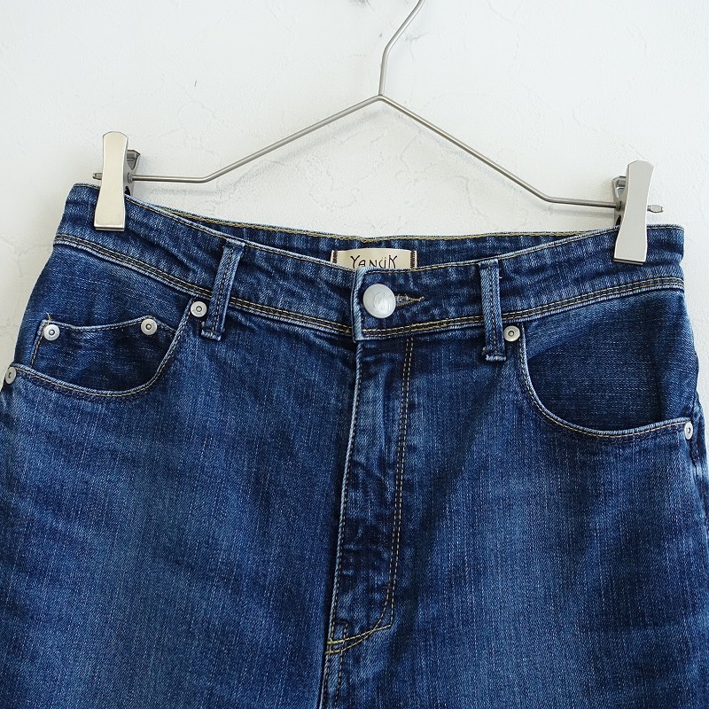 | YANUKのコットンブレンドデニムパンツです。カラーはインディゴブルーで、少しストレッチの効いたデニム地で仕立てられています。開口部はボタンとジッパーで、コインポケットを含む5ポケット付きです。定価(メーカー希望小売価格) 28,600円の商品です。 |