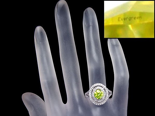 ガードル部に【Evergreen】ブランド刻印有り!超希少な超大粒極上1粒天然アップルグリーンダイヤモンド1.27ct&極上クリアダイヤモンド総計0.64ctを素敵に宝飾した、超高級K18ホワイトゴールドリングを激安価格で特別大放出致します!