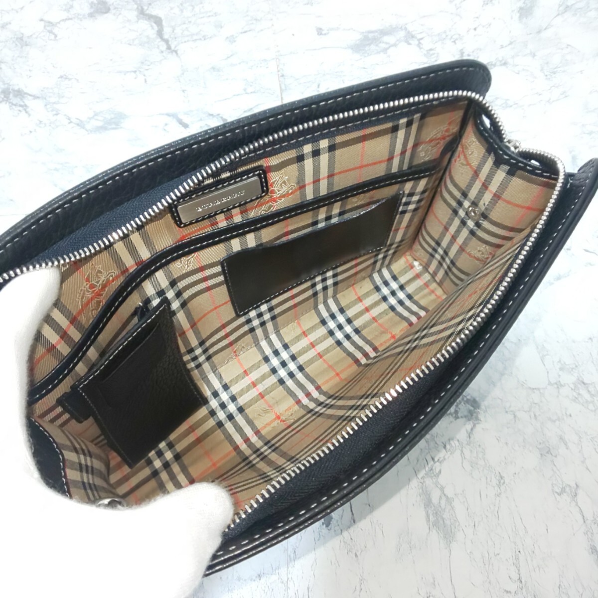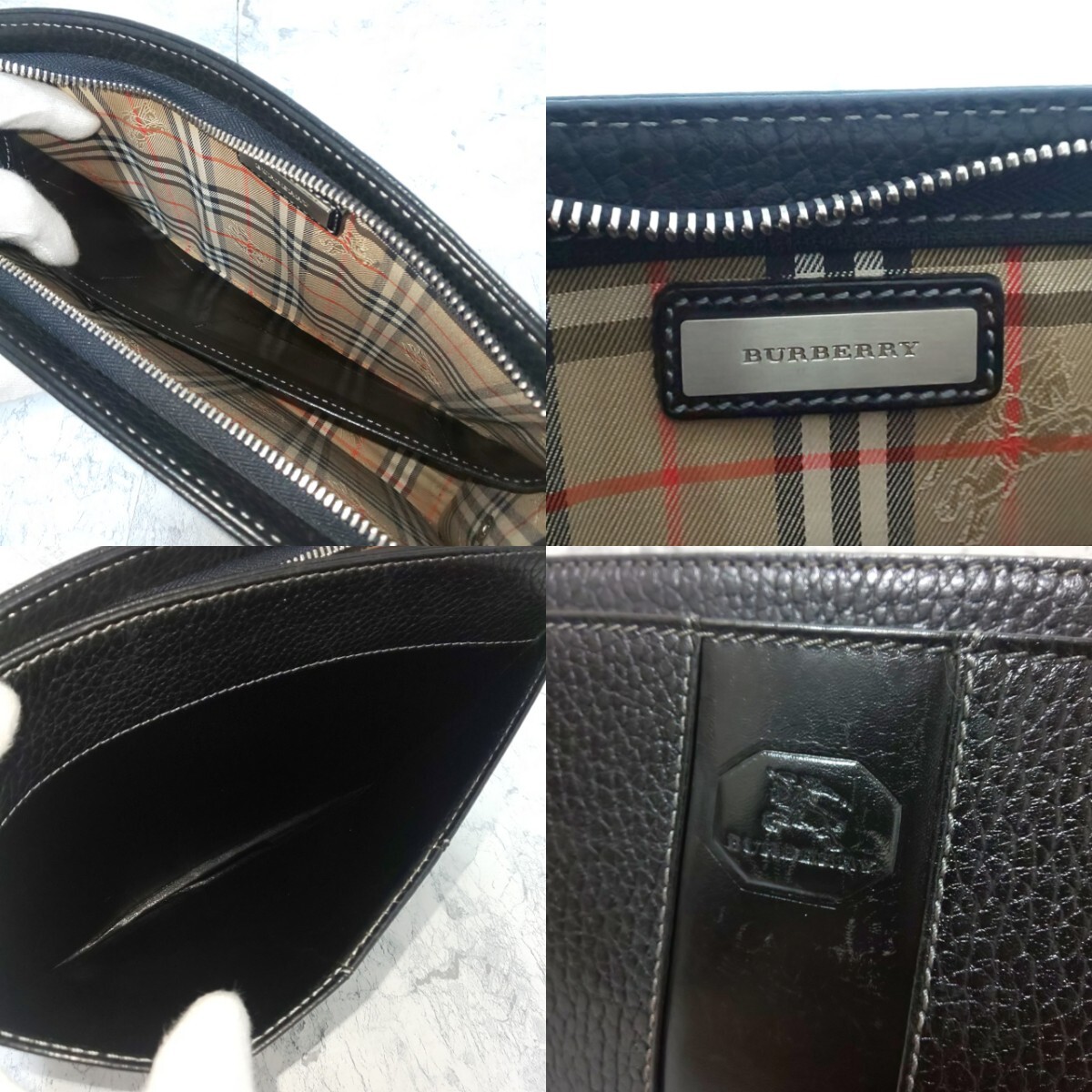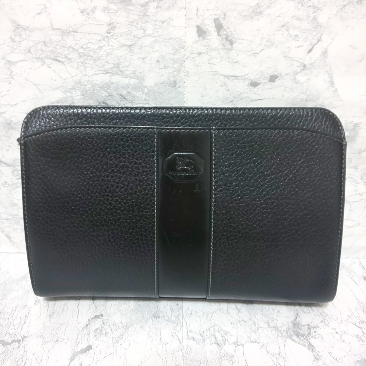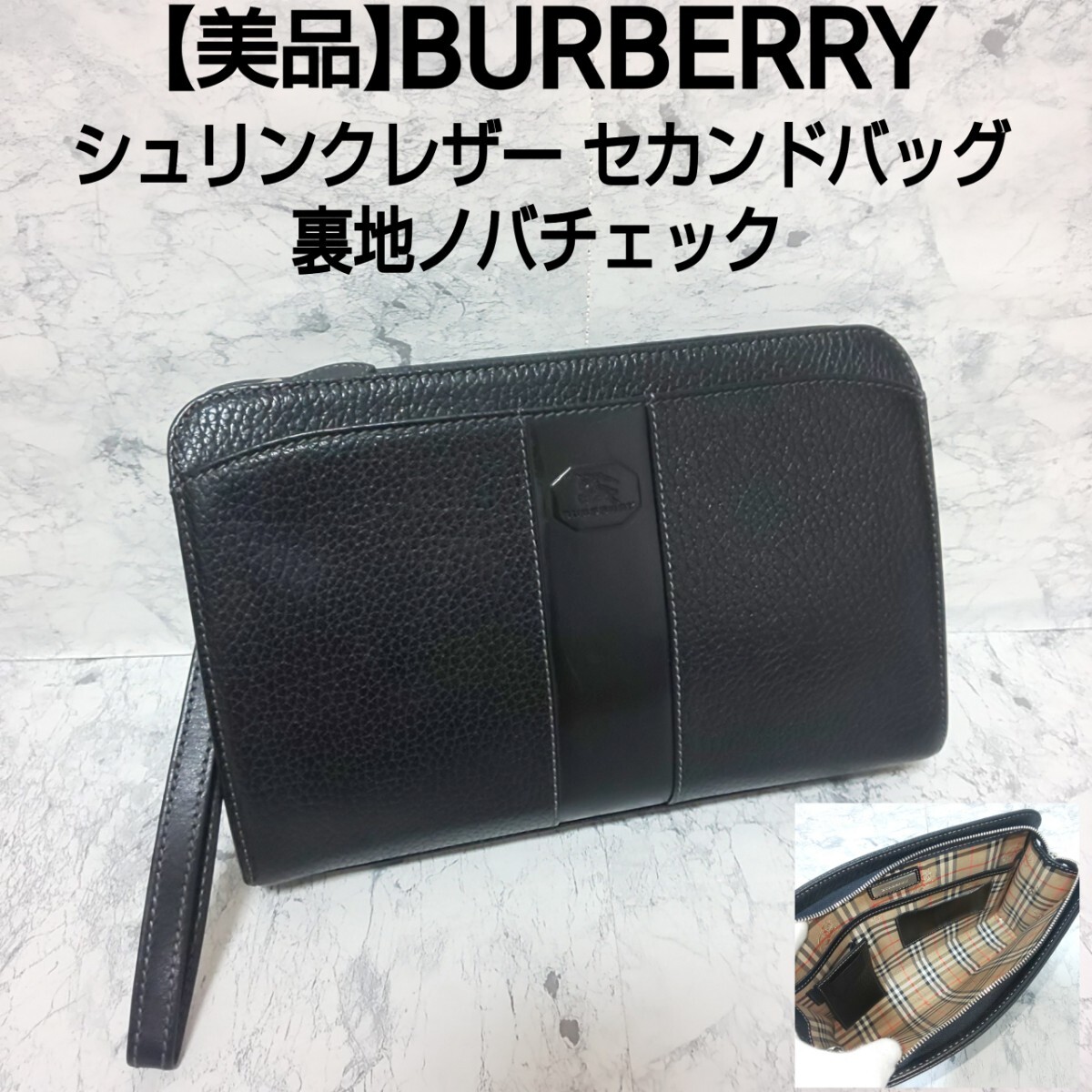 【美品】BURBERRY バーバリー シュリンクレザー セカンドバッグ クラッチバッグ ハンドバッグ 裏地ノバチェック ホースロゴ シボ革
