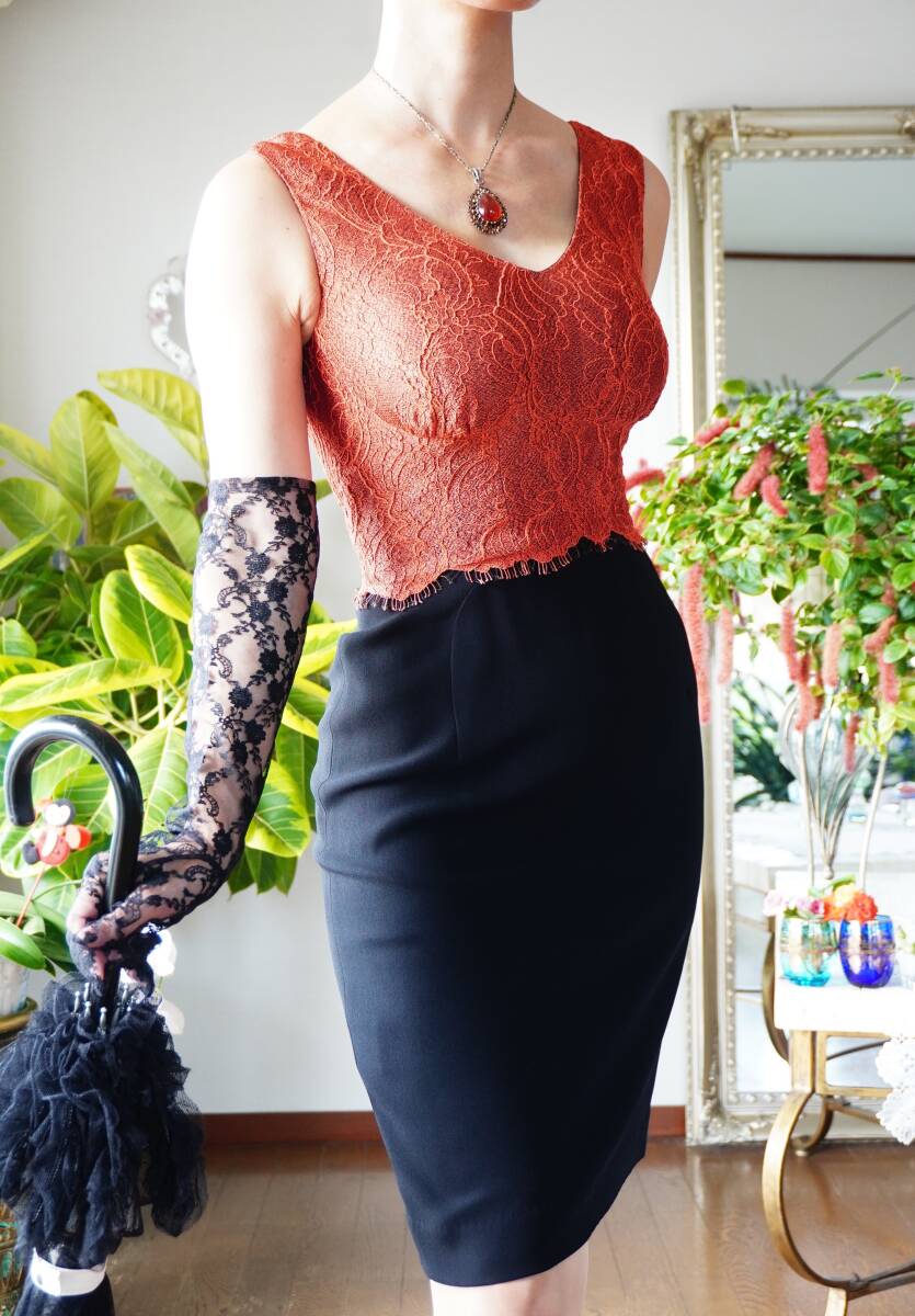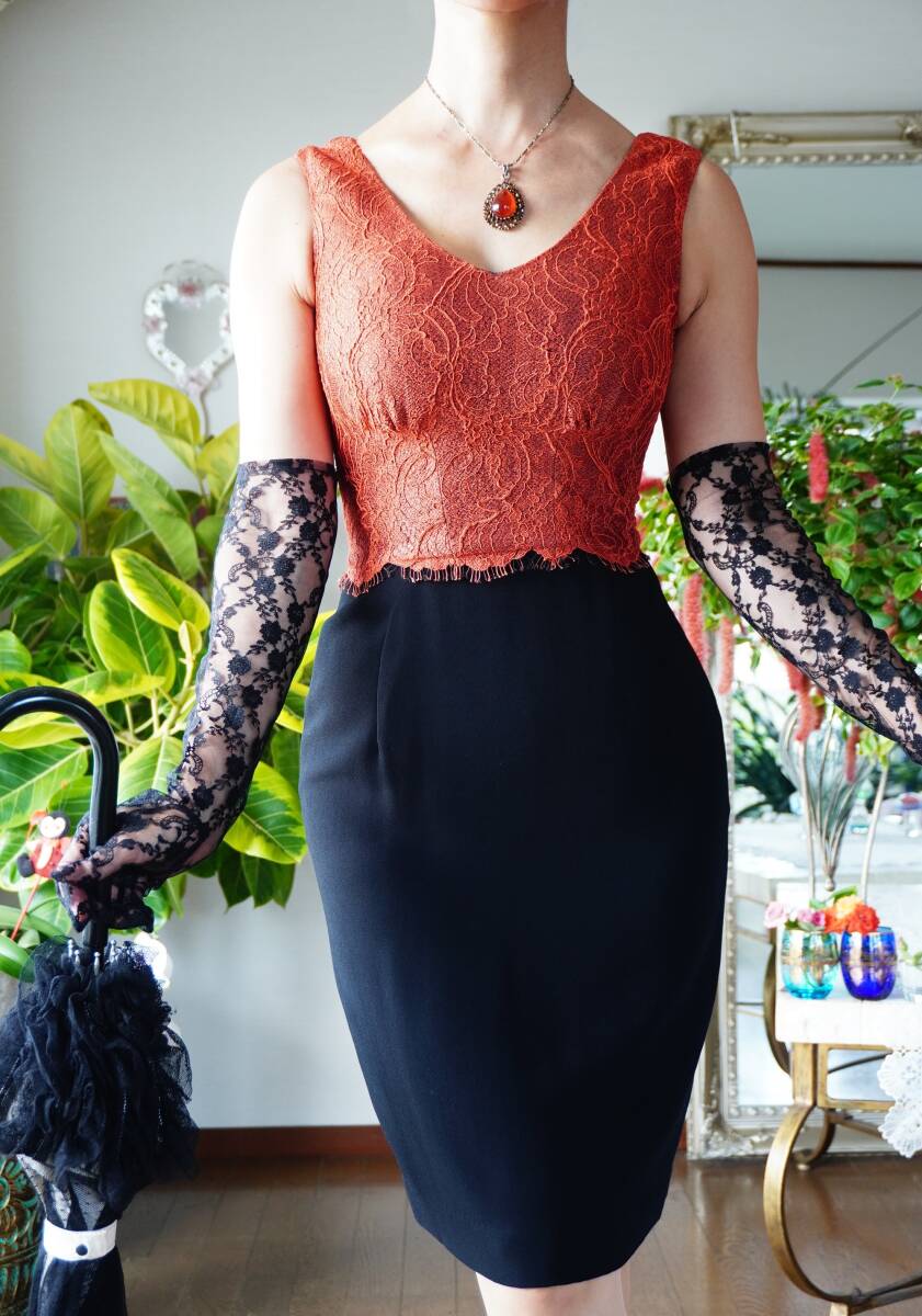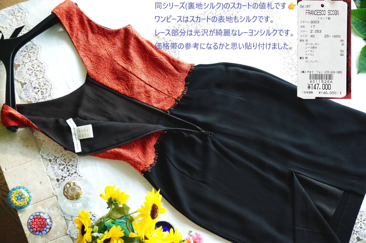 ●素材:表裏シルクで、赤レンガ色レース部はレーヨン80%、ナイロン20%の光沢混紡。
