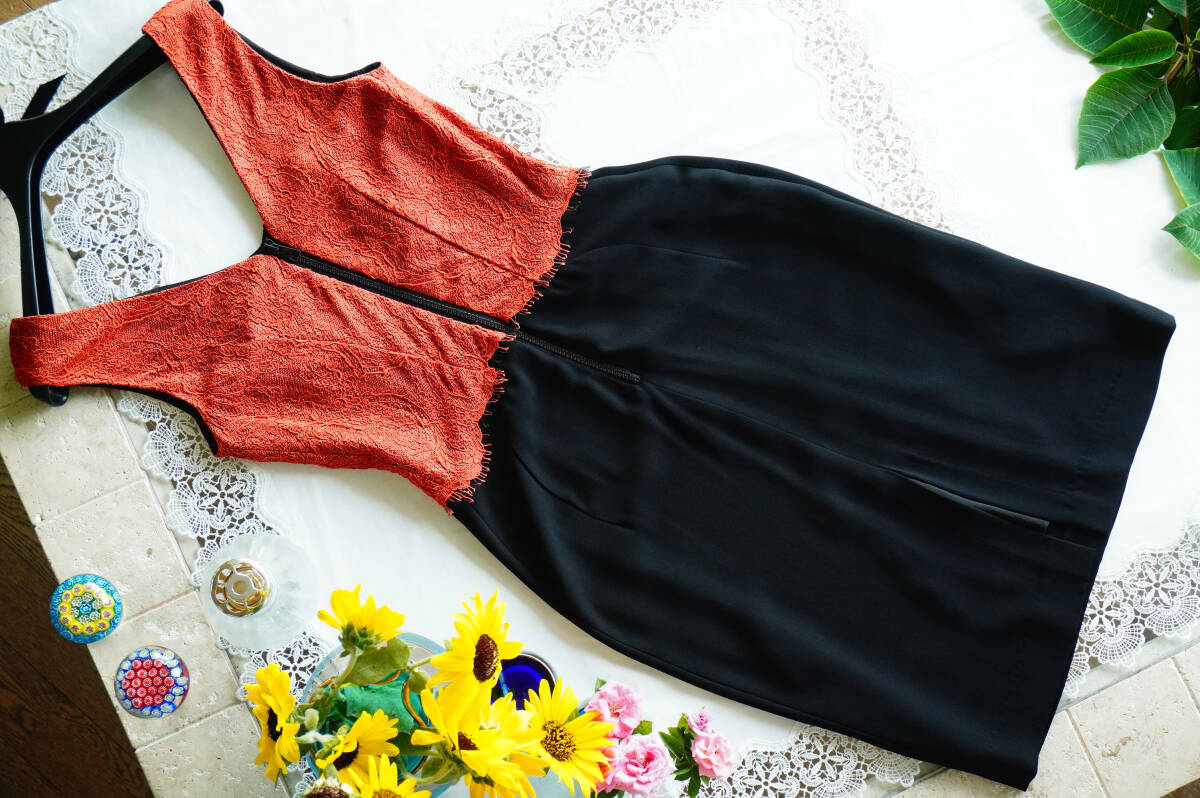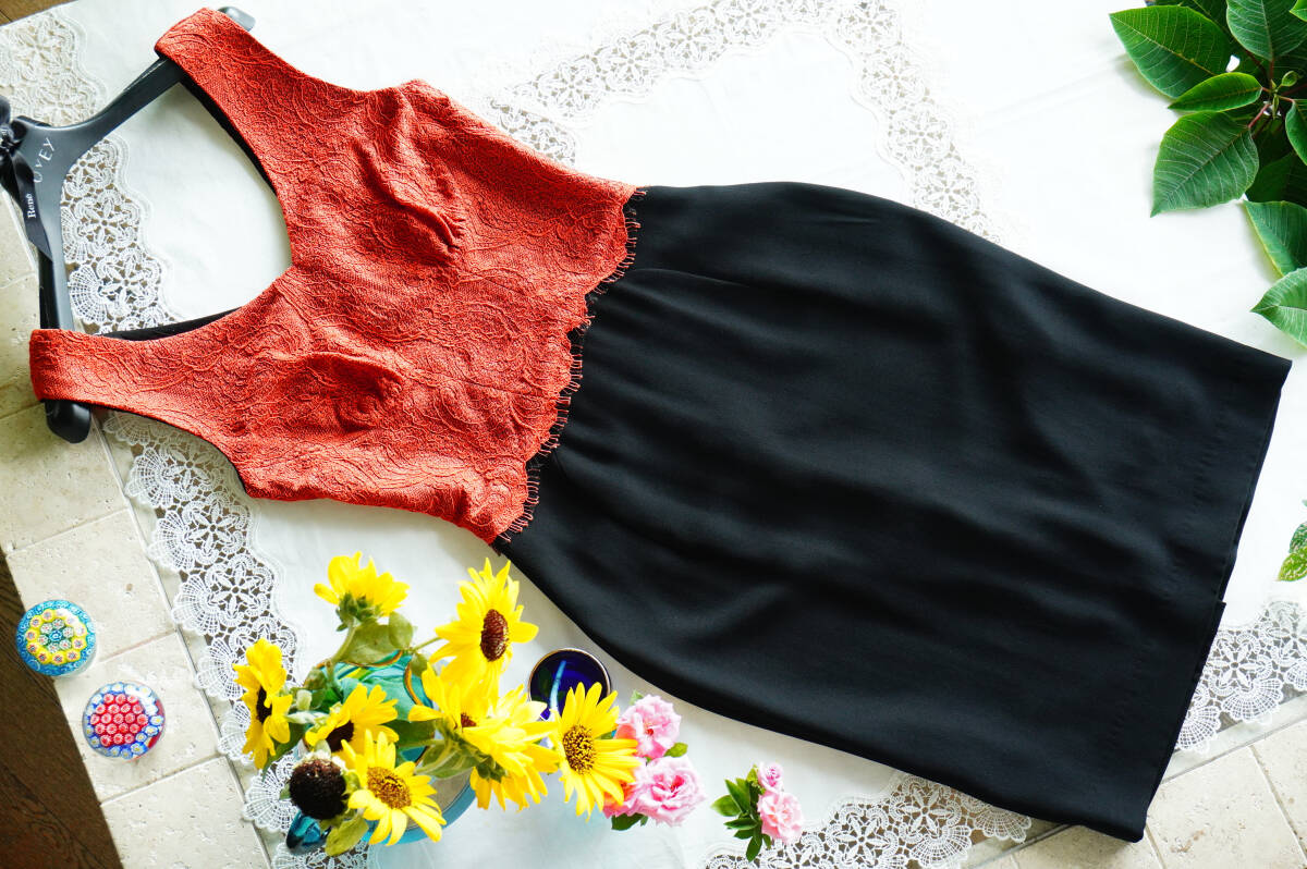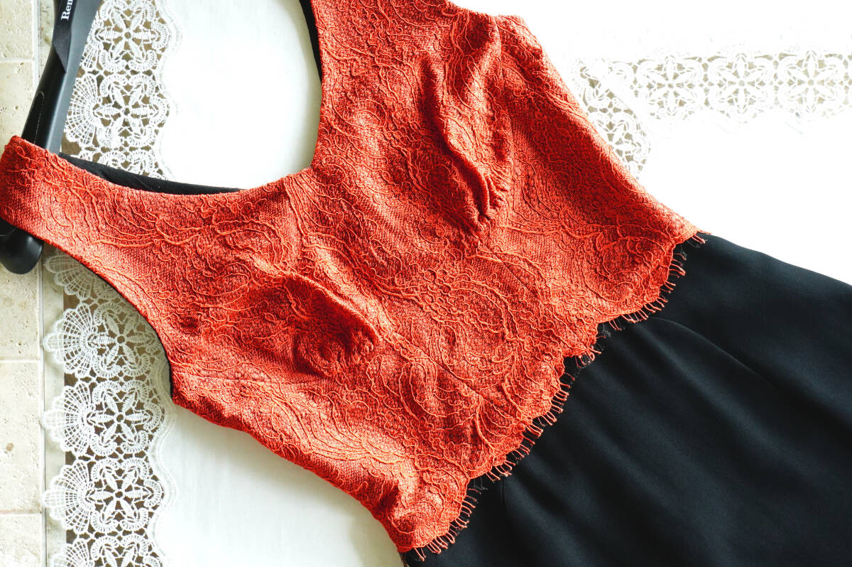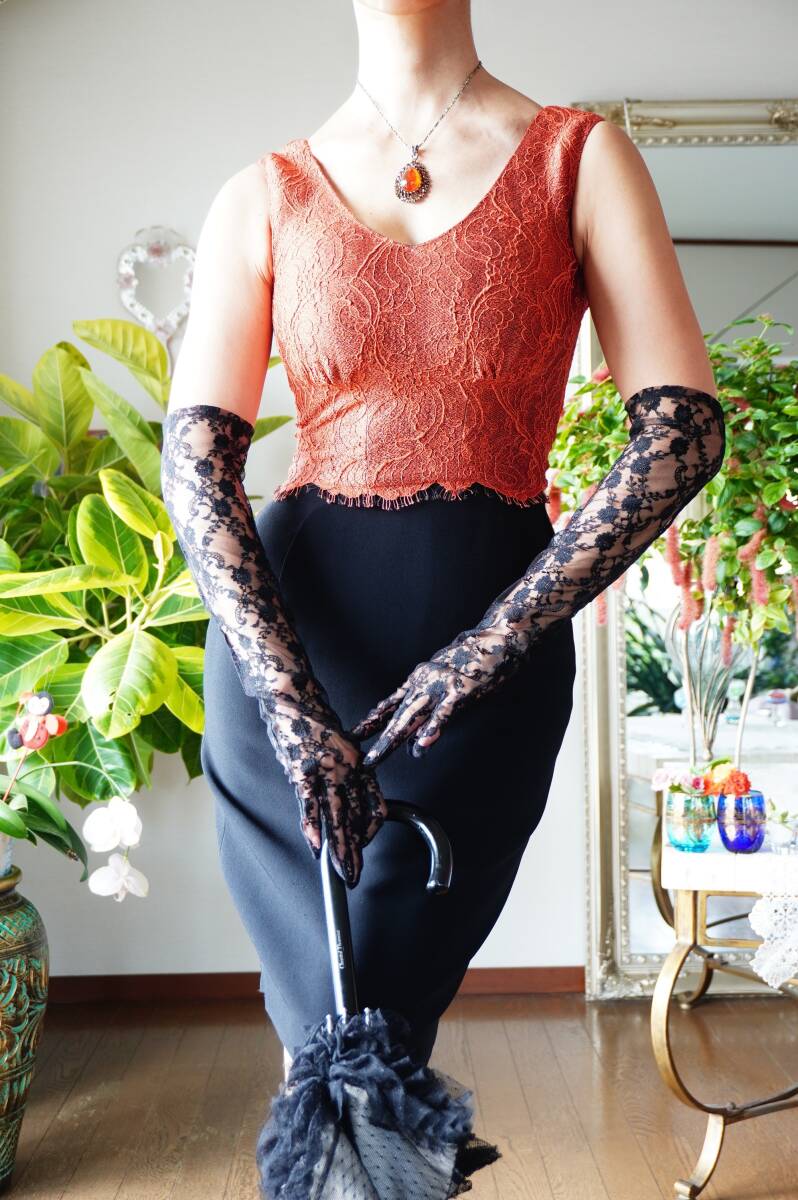 ●素材:表裏シルクで、赤レンガ色レース部はレーヨン80%、ナイロン20%の光沢混紡。
