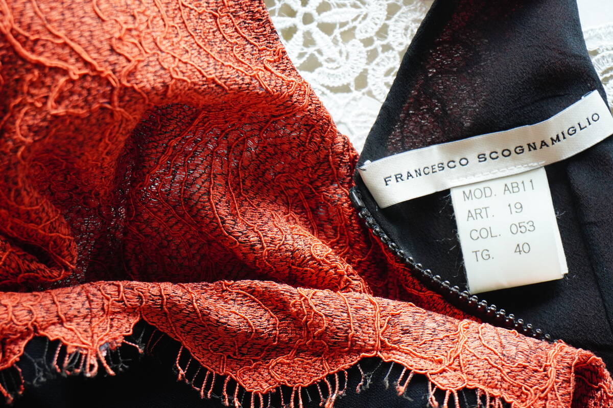 イタリア製*32万8000円 FRANCESCO SCOGNAMIGLIO*表裏シルクx光沢レースの立体美形タイトワンピース*フランチェスコスコニャミッリョ*黒赤SM
