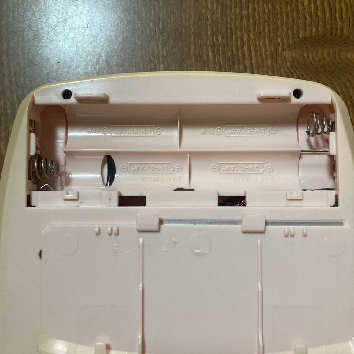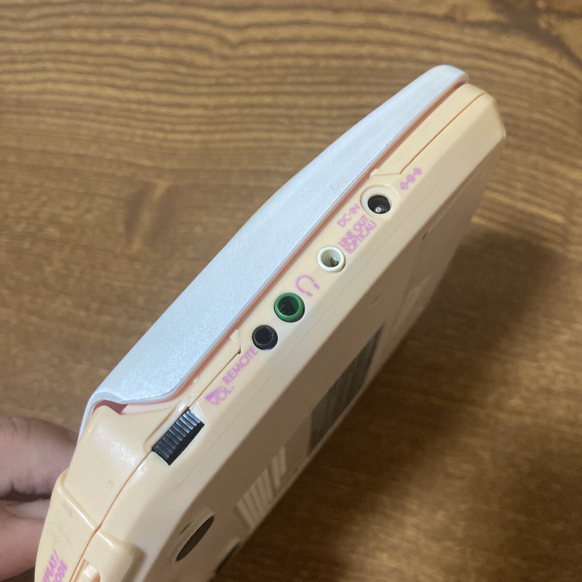 ■収集品整理のため出品します。手持ちの ACアダプターと乾電池で動作確認しています。この機種は単3乾電池4本仕様ですが、2本でも再生します。蓋を開けた時、はね上がらないので、手で開ける必要があります。電池蓋は元来蓋が外れない構造になっているようですが、電池蓋両側のヒンジが欠けていて取り外し出来ます。全体的に色やけがあります。