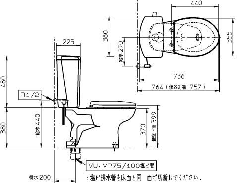 1つで4種配管(75・100/VU・VP)対応の排水ソケットを採用。