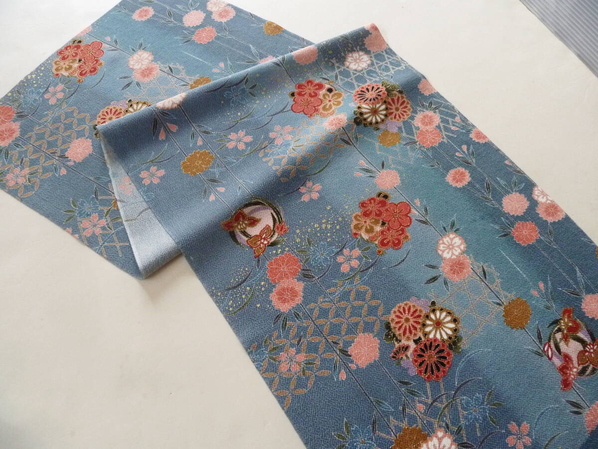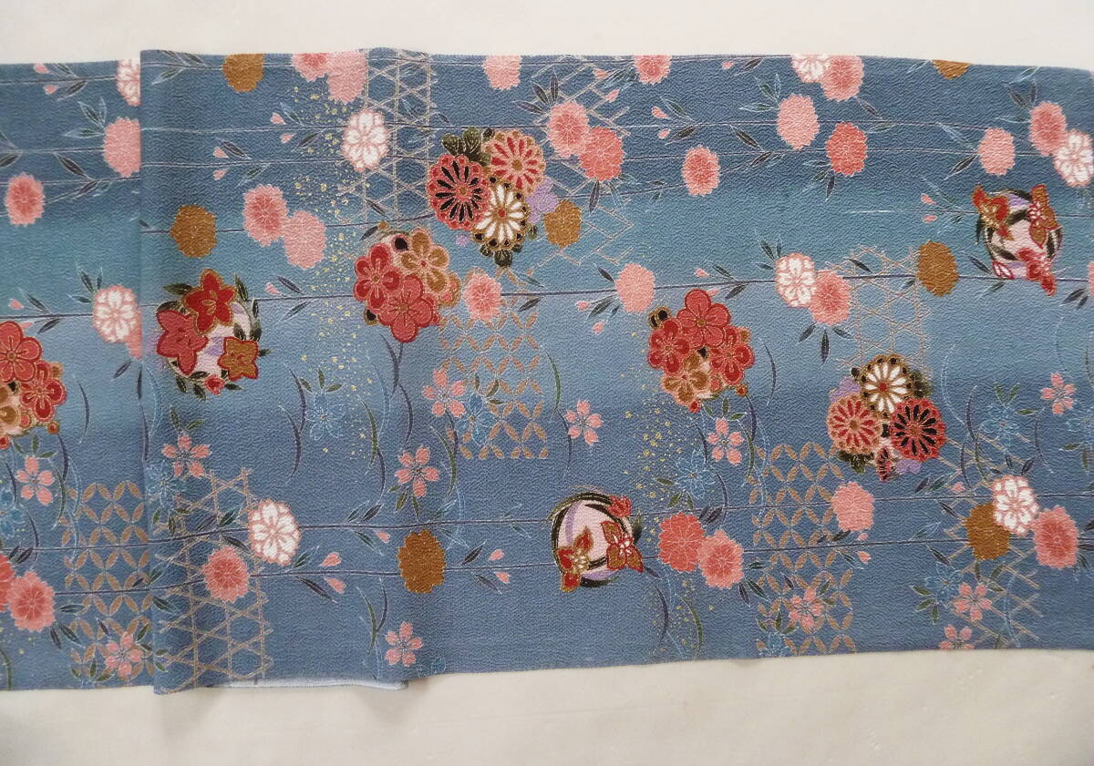 ■彩■古布着物はぎれ/ハギレ 36×100 正絹 縮緬 しだれの八重桜 花の丸 御召御納戸 くすみ青色 鬼しぼ