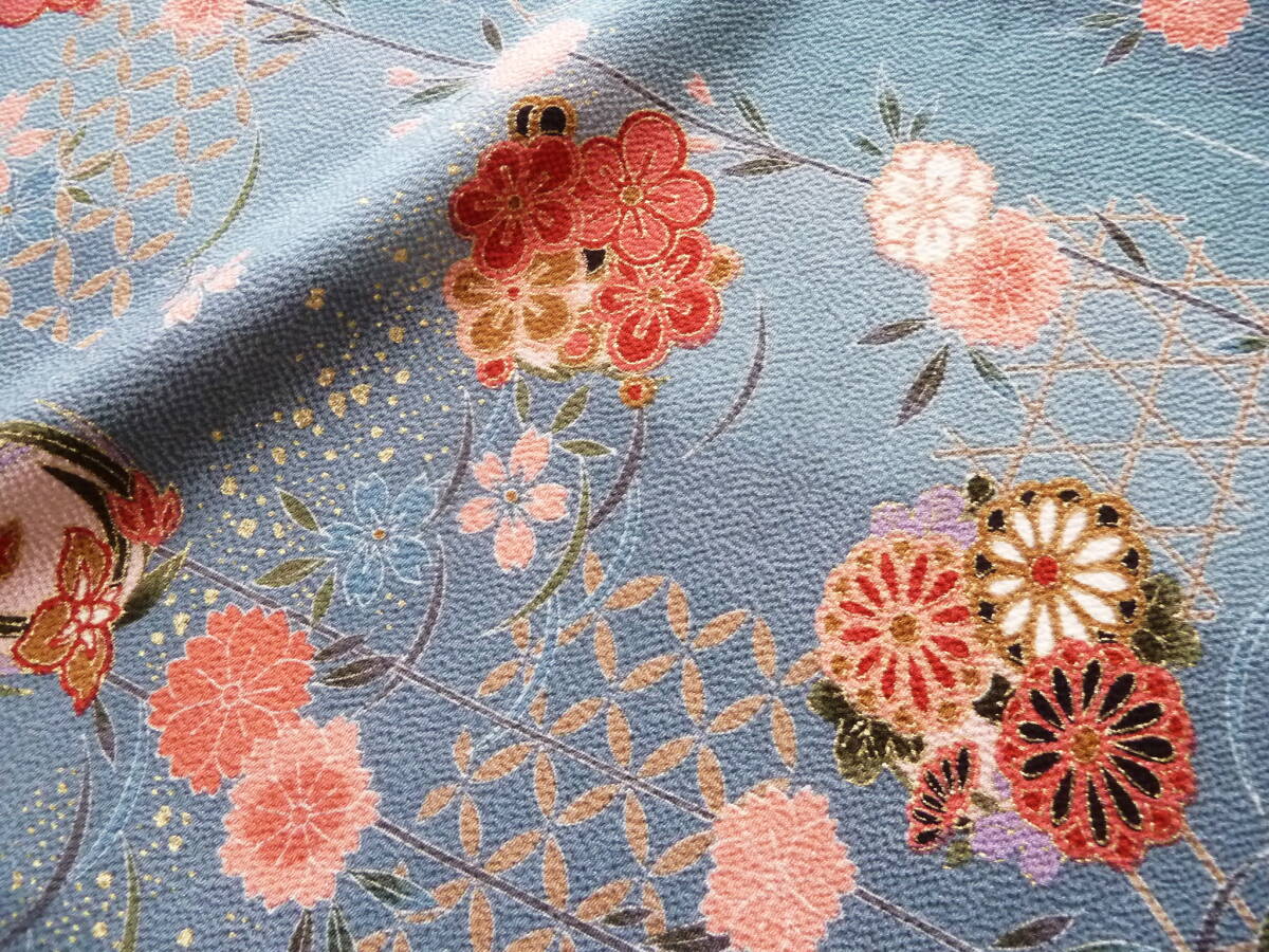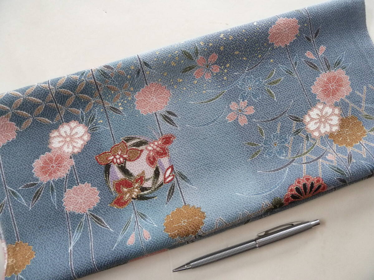 ■彩■古布着物はぎれ/ハギレ 36×100 正絹 縮緬 しだれの八重桜 花の丸 御召御納戸 くすみ青色 鬼しぼ シルク お人形