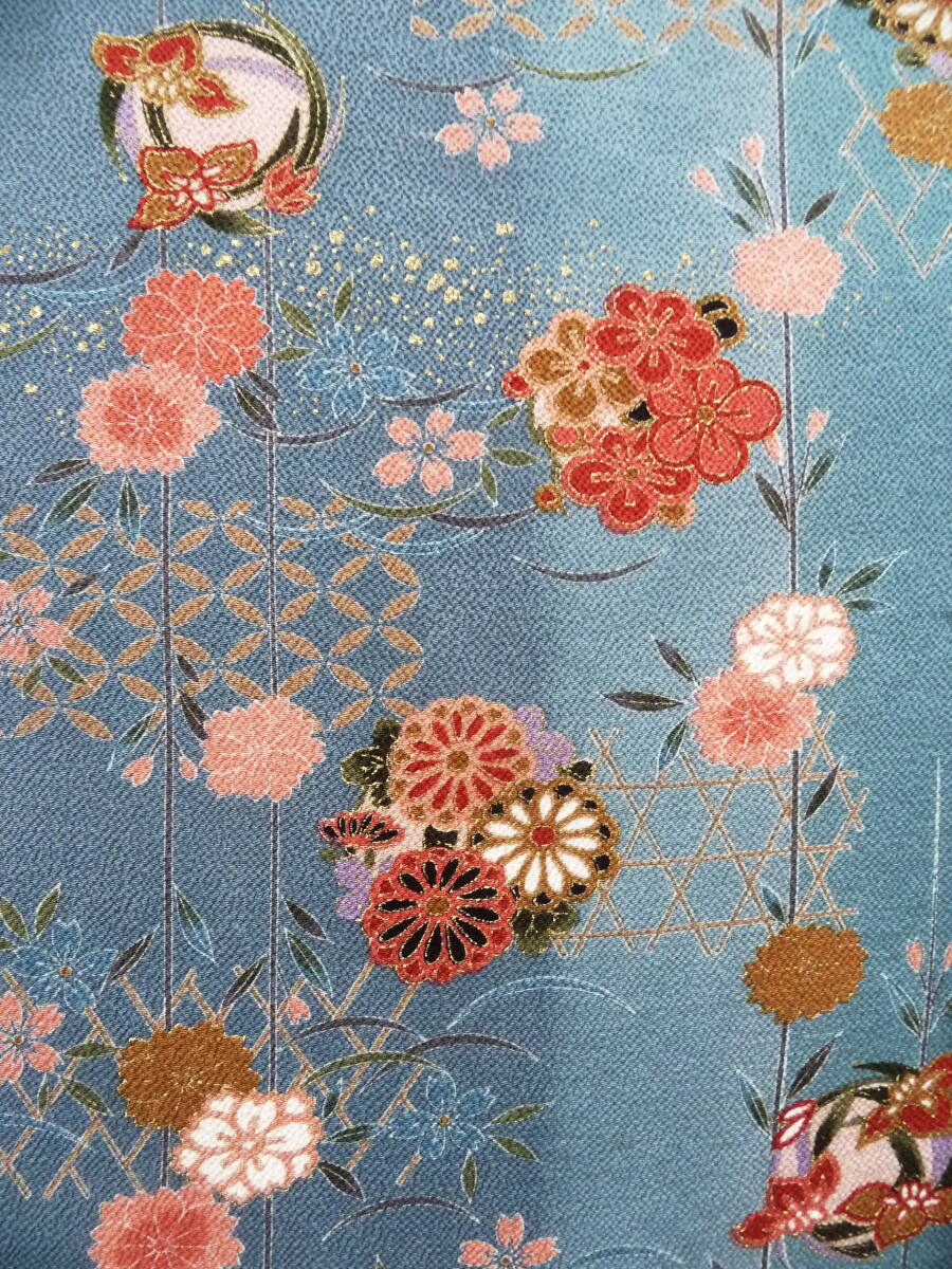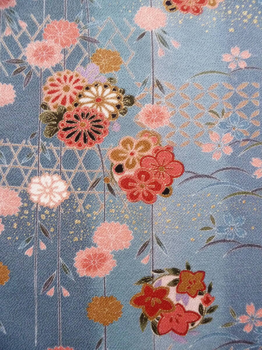 地色は渋いくすみ青色系のぼかしになります。和の色名では御召御納戸 (おめしおなんど)が近いでしょうか。