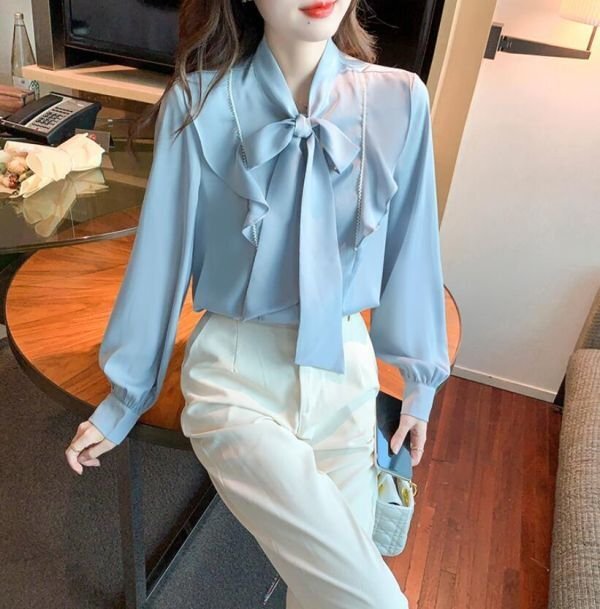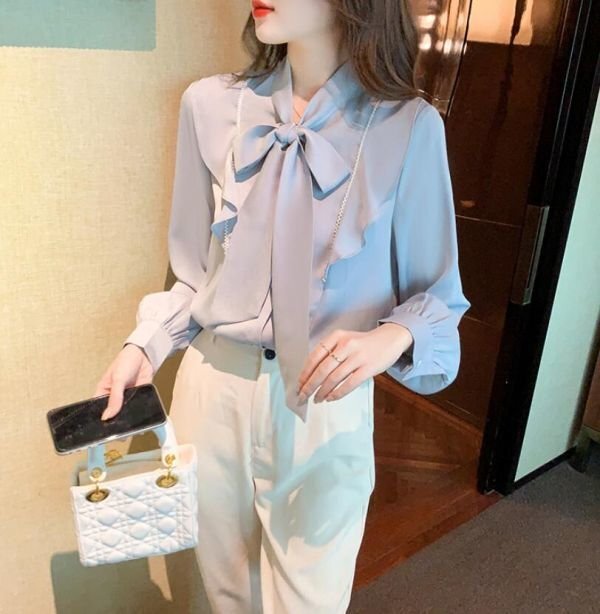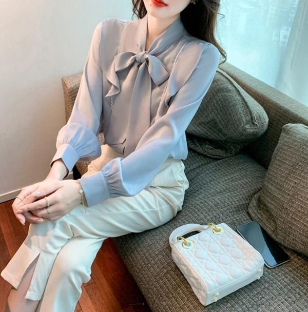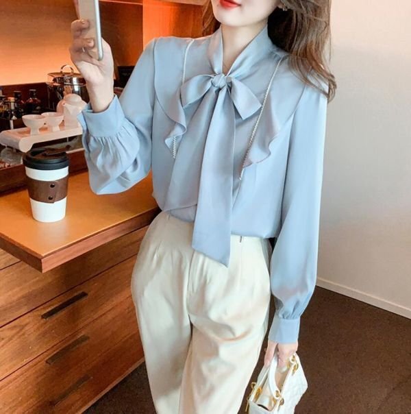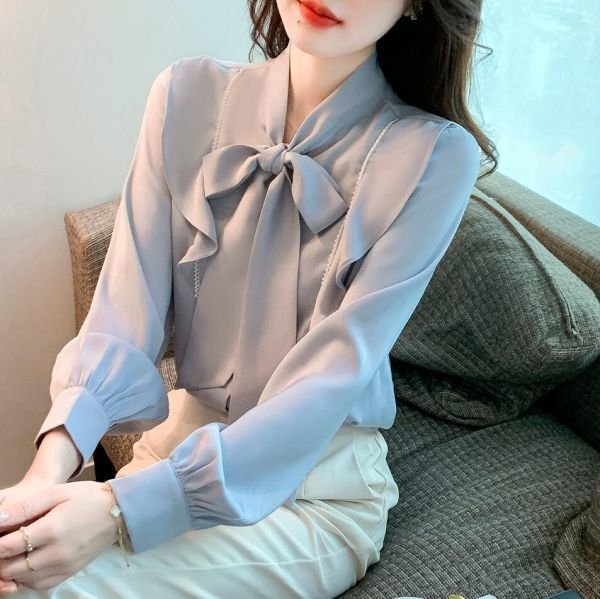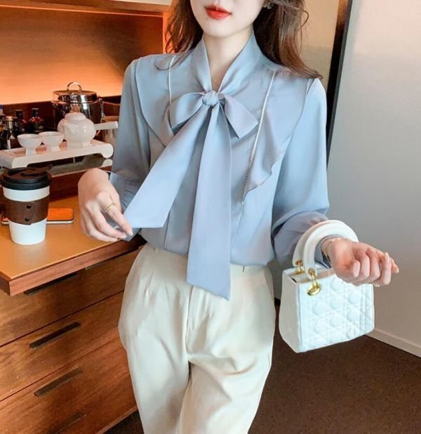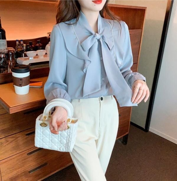 ブラウス 長袖 春秋 オフィスブラウス オシャレ シフォントップス 韓国風 大人 通勤OL ゆったりシャツ★Lサイズ