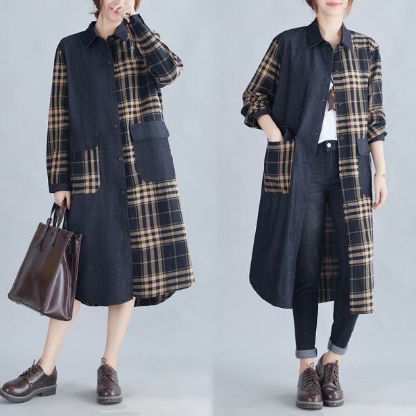 フリーサイズ■ 秋新品 カジュアル 大きいサイズ 綿麻 ゆったり チェック柄 切り替え 大ポケット 長袖 シャツ チュニックワンピース ★