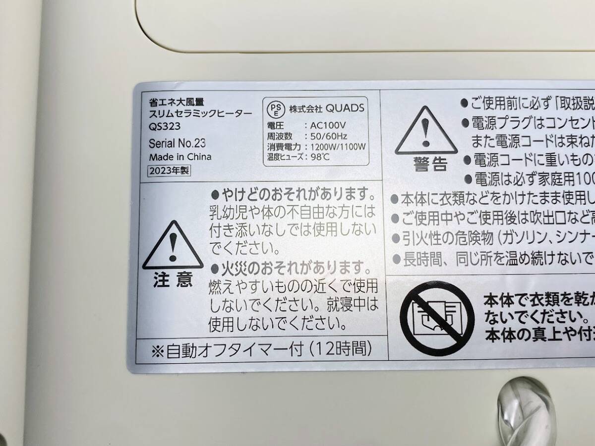 【美品・訳アリ】QUADS' 省エネ 大風量 スリムセラミックヒーター QS323 暖房器具 ヒーター 人感センサー